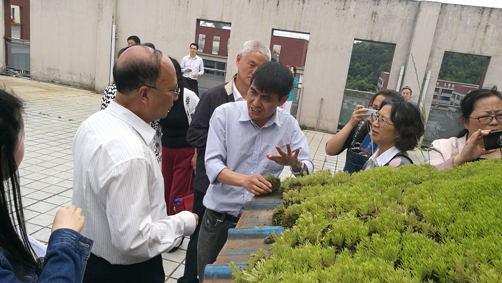 图3:吴永贵教授向左定超解释屋顶快熟生态保护与绿化节能技术