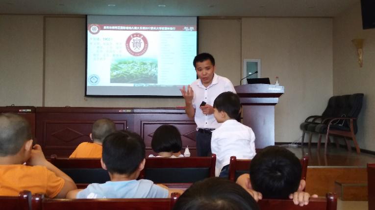 值此中国共产党成立96周年之际,国土资源部喀斯特环境与地质灾害重点实验室和资源与环境工程学院环境科学与工程系何守阳副教授组织的“贵州大学校园生活体验夏令营活动”圆满落幕,来自贵阳市南明区国际城幼儿园2017届毕业班的20位小朋友及家长共40余人参加了此次夏令营活动。活动启动仪式在436会议室举行,何守阳副教授首先向参加活动的家长和小朋友介绍了贵州大学的基本情况,重点介绍了资源与环境工程学院和喀斯特重点实验室专业设置、办学条件及科学研究特色等,并与孩子进行了现场互动。
