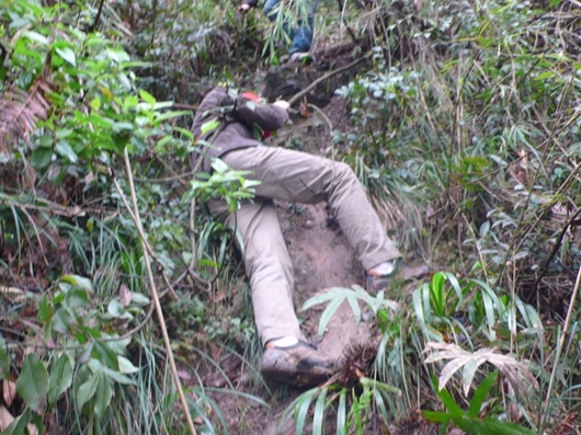 王勇老师调侃说,排查地质灾害时,随身除了罗盘、放大镜、地质锤“地质三件宝”之外,还要常备三件宝:竹竿、刀片和大蒜。“竹竿是用来探地和打蛇的。排查地质灾害的时候,我们经常会遇到塌陷坑,一旦陷进去就会非常危险。所以我们去勘测的时候,一定会带上一根竹竿探路;而竹竿的另一个作用就是打蛇。地质勘测总是到人迹罕至的地方,山里蛇多,拿竹竿也可以打蛇。刀片的用途是如果一旦被蛇咬伤,可以立刻拿来割开一个十字形的口子,把毒血挤出来,缠上绷带做应急处理。另外,我们在勘测时,不可能随身带大量的饮用水,当我们在喝山泉或者雨水时都会吃上几瓣大蒜,帮助消毒。”
