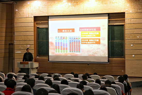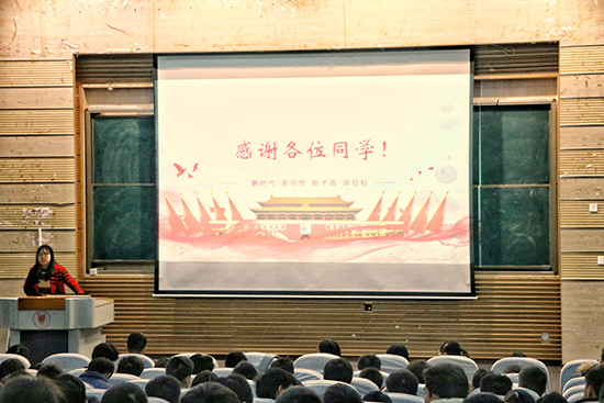 接着,学院党委副书记徐进老师为大家解读十九大精神相关内容。首先,徐进老师为同学们播放一个关于十九大的简短视频。之后为同学们仔细解读十九大精神,解读大会主题:不忘初心,牢记使命,高举中国特色社会主义旗帜,决胜全面建成小康社会,夺取新时代中国特色社会主义伟大胜利,为实现中华民族伟大复兴的中国梦不断奋斗。徐进老师用多组图片进行纵向和横向比较,说明我们国家从站起来到富起来,再到强起来。并引用习近平总书记在十九大报告中提到:“青年兴则国兴,青年强则国强。青年一代有理想,有本领,有担当,国家就有前途,民族就有希望。”以此来表达对我院青年学子们的殷切期望。
