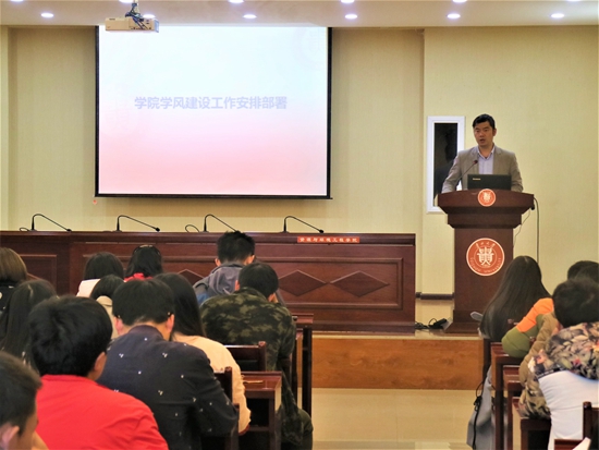 徐进副书记对我院学风建设工作进行安排部署。讲话中,他传达了我院学风建设实施细则,要求严格落实考勤制度,加强对学生的督导引导作用,组织学习《学生手册》及做好学业预警,学生干部要以身作则,带头营造良好的学习氛围。