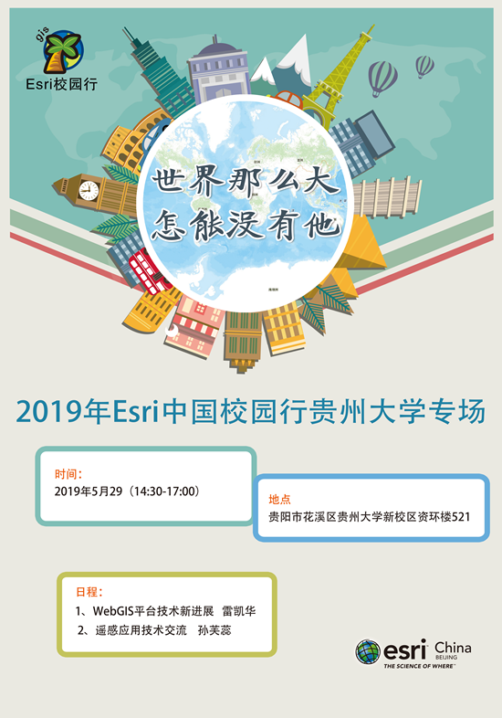 (贵大资环网讯 周涌|报道 )2019年5月29日下午14:30-17:00,ESRI中国将在贵州大学资环学院521多媒体教室开展专场技术交流会,主要涵盖两方面内容: