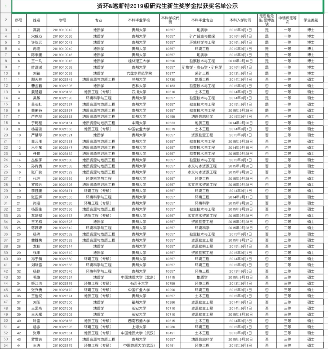 资环&喀斯特2019级研究生新生奖学金拟获奖名单公示