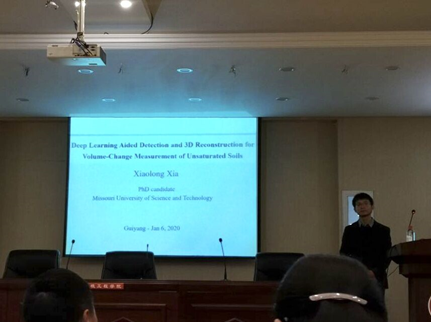 2020年1月6号上午九点,贵州大学资源与环境工程学院在资环楼436学术报告厅隆重举行了贵州大学“黔岩”学术讲坛,特邀美国密苏里科技大学夏晓龙博士作学术报告,夏晓龙博士报告题目为:Deep Learning Aided Target Recognition and 3D Reconstruction for Measuring Volume Changes of Unsaturated Soils in Triaxial Tests,并与同学分享了出国留学与英文写作的经验。资环学院史文兵老师主持本次讲座。