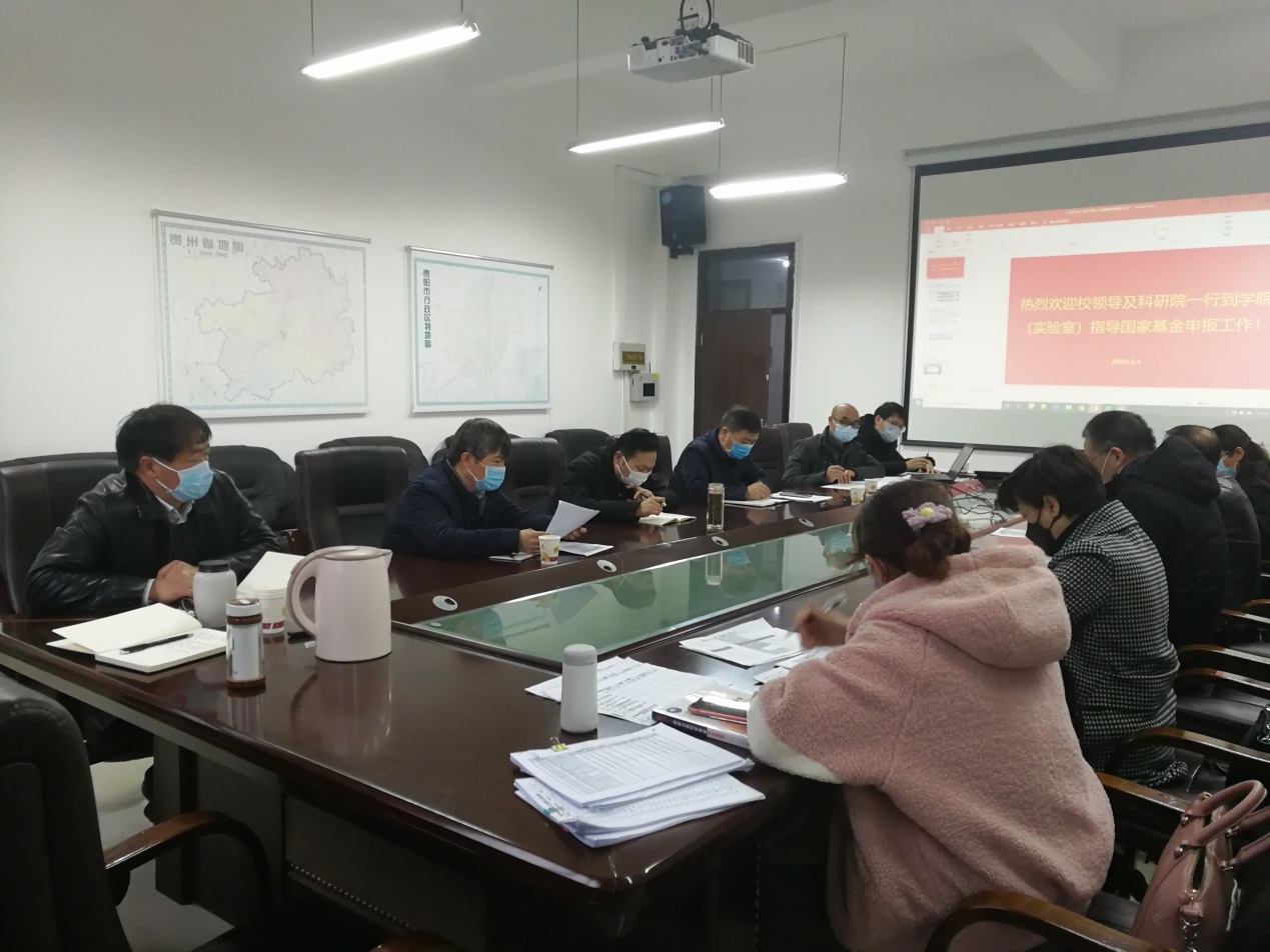 首先,院长吴攀教授就学院工作做详细汇报。听取汇报后,校领导、科研院领导与学院班子围绕学院各项工作开展情况进行交流。宋宝安校长对学院的前期工作进行了肯定,并对学院基金申报、招生就业、学科评估、人才引进、线上教学、服务地方等工作做出了具体指示及要求。科研院院长杨松教授根据自身多年经验,对学院国基申报书中存在的具体问题提出修改意见,对提高学院国基申报的质量有重大的指导意义。最后,李军旗副校长对学院的国基申报工作给予了肯定并对下一步的申报工作方向进行了指导。