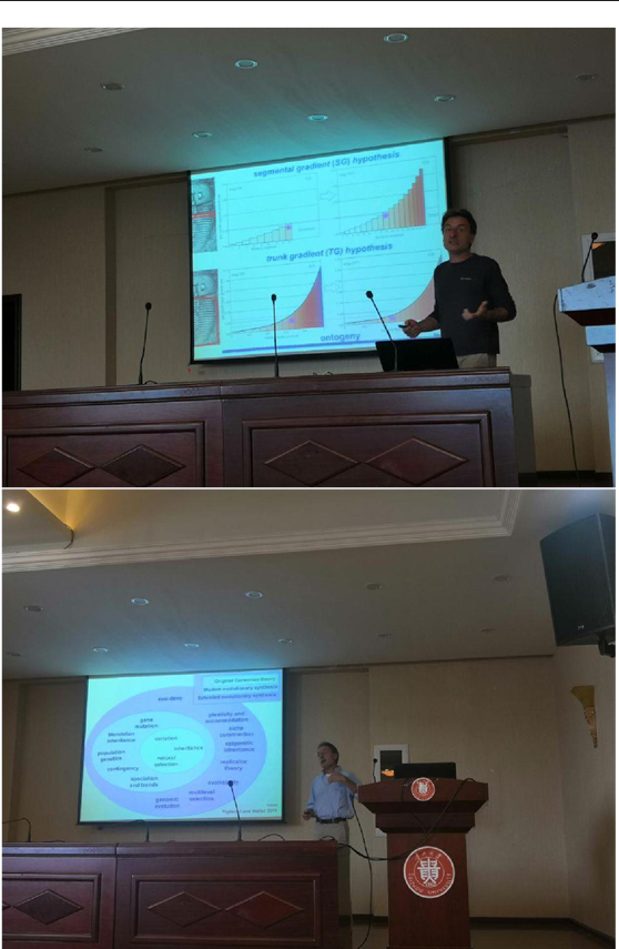 2019年5月23日和28日,“黔岩”学术讲坛贵州大学第五期(第一场)在贵州大学资环学院436报告厅进行,报告题目分别为:Getting blood out of stones 1:Fossil on to genies inevolutionary developmental biology(evo-devo)和Getting blood out of stones 2:Trilobite development insightsinto arthropod evolution,报告人帕瓦多大学Giuseppe Fusco教授,长期从事演化生物学及发育生物学研究。其研究内容包括节肢动物的形态演化和胚后发育;生物演化变异中的发育约束;表型可塑性、表型鲁棒性等;生物演化动态的数学建模。
