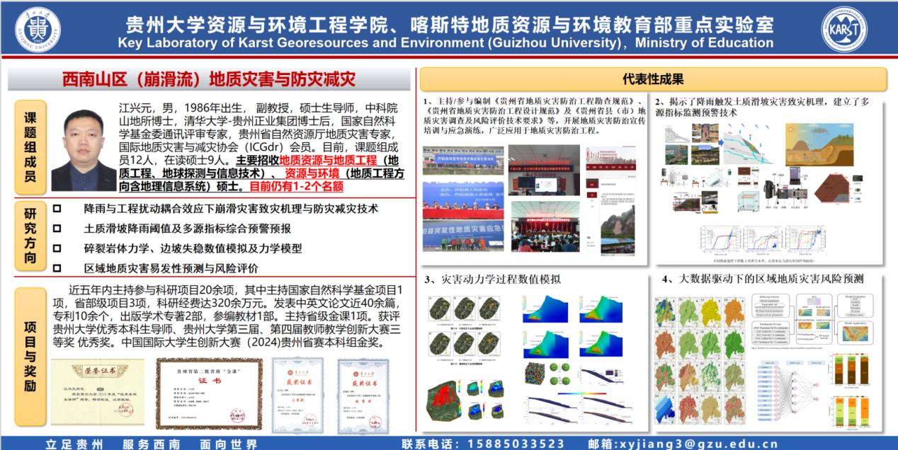 | 姓 名:江兴元 ![]() 职称/职务:副教授/地质工程教研室主任 研究领域:①特殊岩土体工程力学特性 ②岩溶山地崩滑流灾害机理与过程 ③地质灾害空间评价与防灾减灾 Email:xyjiang3@gzu.edu.cn 微信:erickjiang 硕士招生专业:地质资源与地质工程(地质工程方向、地球探测与信息技术)、资源与环境(地质工程方向含地理信息系统)。 寄语:年少应有鸿鹄志,当骑骏马踏平川,欢迎有志青年加入! |