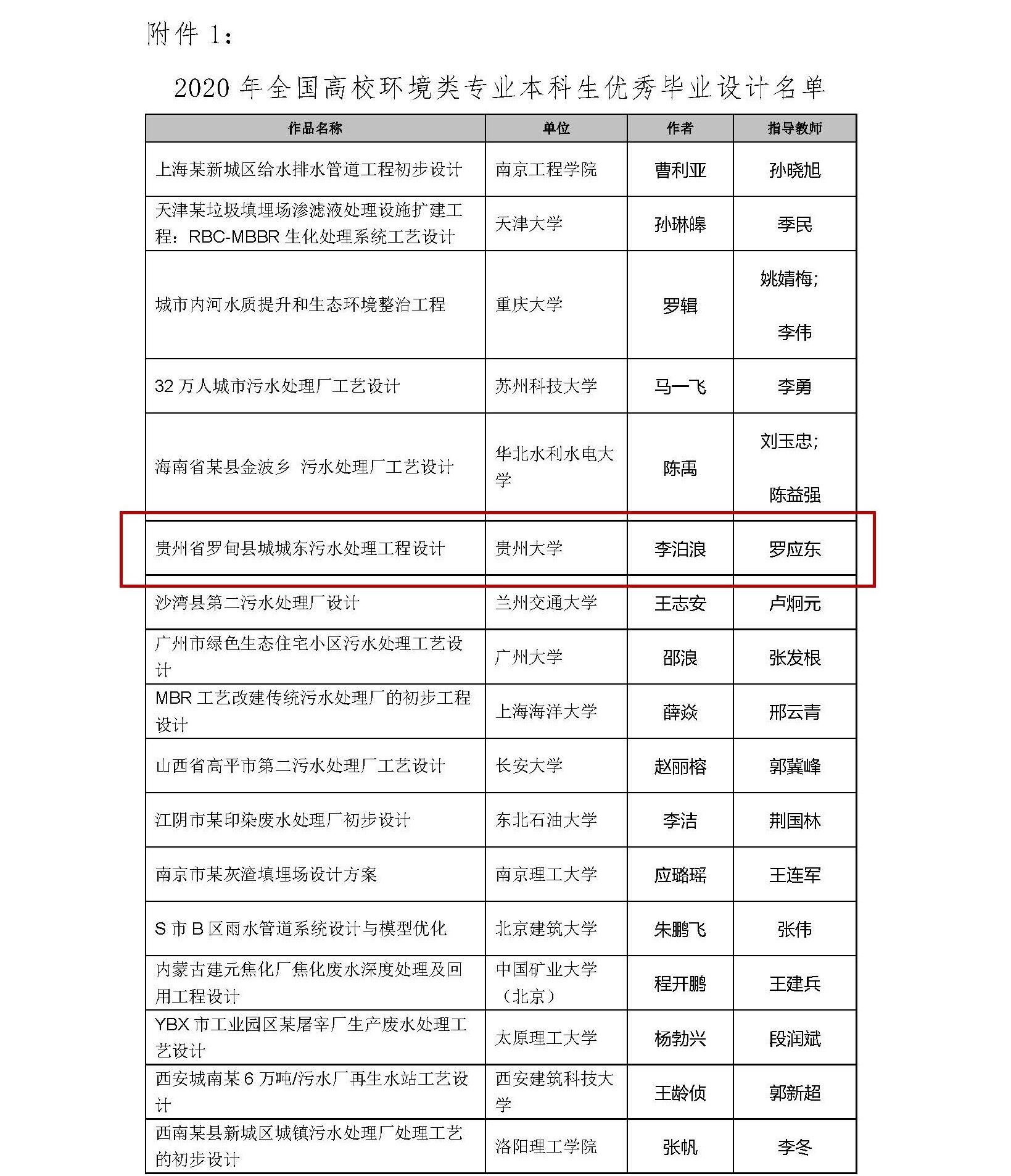 我院环境工程161级李泊浪同学获得2020年全国高校环境类专业本科生优秀毕业设计称号,李泊浪同学的毕业设计题目为《贵州省罗甸县城城东污水处理工程设计》,指导教师为我院外聘导师罗应东。