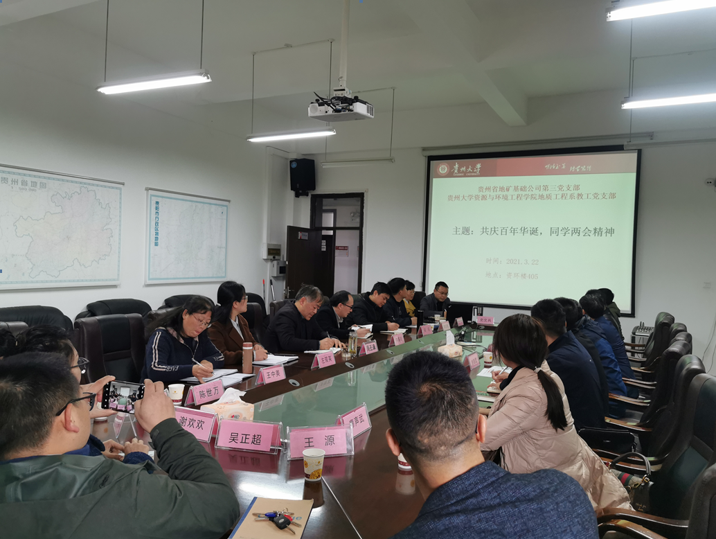 2021年3月22日,贵州地矿基础工程有限公司党委委员、总工程师廖德武同志带领公司第三党支部党员和部分技术人员到我院与地质工程系教工党支部全体党员开展了主题为“共庆百年华诞,同学两会精神”的党建工作经验交流活动。两个支部党员共同回顾了2021年“两会”热点话题,一起学习了2021年全国“两会”重点关注的 “成绩单”、十四五发展规划和2035年远景目标、新一年的经济社会发展目标三大内容等内容。