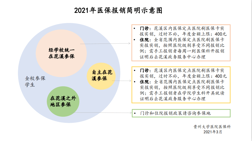 2、住院:全省范围内医保定点医院刷医保卡实报实销,按照医院级别享受不同报销比例:需手工报销者每周一到校医院医保科(北区校医院一楼)开报销证明后去花溪政务服务中心办理。