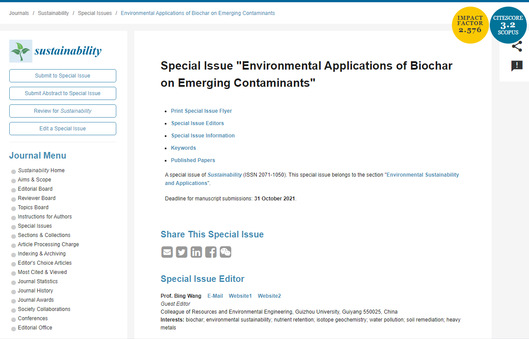 近日,我院环境科学与工程系王兵教授应MDPI出版社旗下期刊Sustainability (ISSN 2071-1050)邀请,担任该期刊“Environmental Applications of Biochar on Emerging Contaminants”特刊客座编辑(Guest Editor),向全球范围内相关研究领域的专家学者公开征集稿件。这将对进一步提升我院在生物炭研究领域及环境科学与工程学科国际学术影响力产生积极作用。