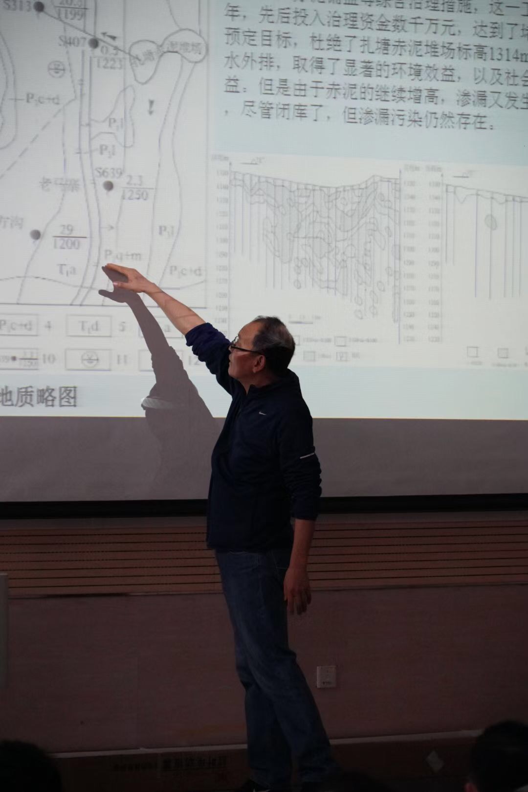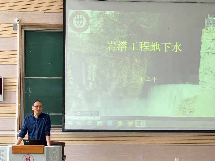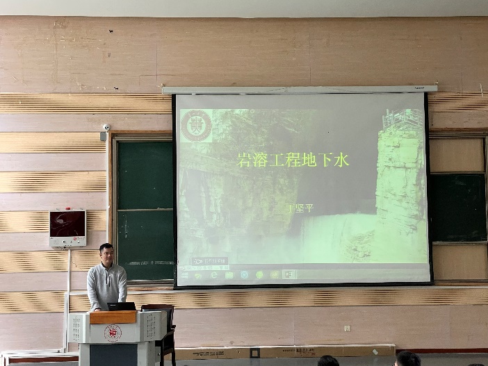 丁坚平教授首先向同学们讲述了他本人亲身参与的贵州平塘“FAST”大射电望远镜选址项目和贵州玉屏核电站工程地质与水文地质调查项目,接着讲授了跟岩溶相关的一系列工程问题,如岩溶水资源调查与评价、岩溶塌陷、岩溶渗漏污染、基坑涌水与治理、矿井突水与预测、机井开发利用等工程地下水方面的理论与实践。在讲座的最后,丁老师告诫同学们要珍惜学习时光,努力提升自己的专业知识水平,鼓励同学们走出去学习,将来为贵州的建设添砖加瓦!
