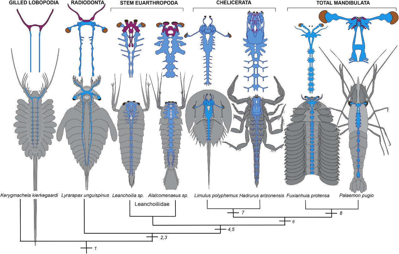 (图中林乔利虫科动物头部中枢神经显示出前脑,中脑和后脑的分化)