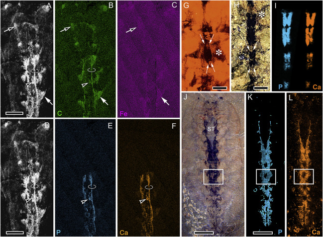 图2 凯里生物群Leanchoiliidae 的神经系统和消化系统(显示出C, Ca和P富集)
