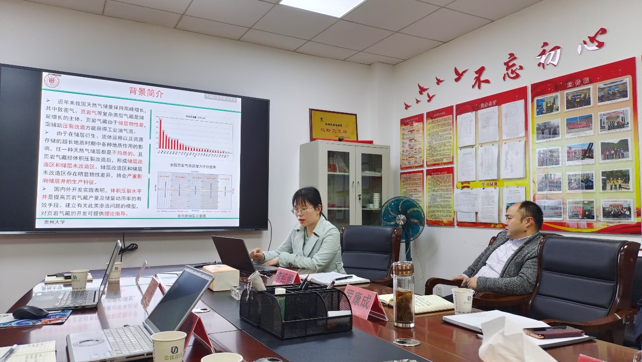 此次会议上,付勇教授就目前页岩气开发技术、研究进展做了详细介绍,并结合贵州省地质实际提出了黔西南地区页岩气勘探开发“浅层套深层、常规加非常规、拓展新区新层系”空间立体勘探开发模式。随后,团队成员覃超副教授、田丰副教授、王科教授分别就自己研究领域在页岩气勘探开发过程中取得的进展以及应用做了详细汇报。