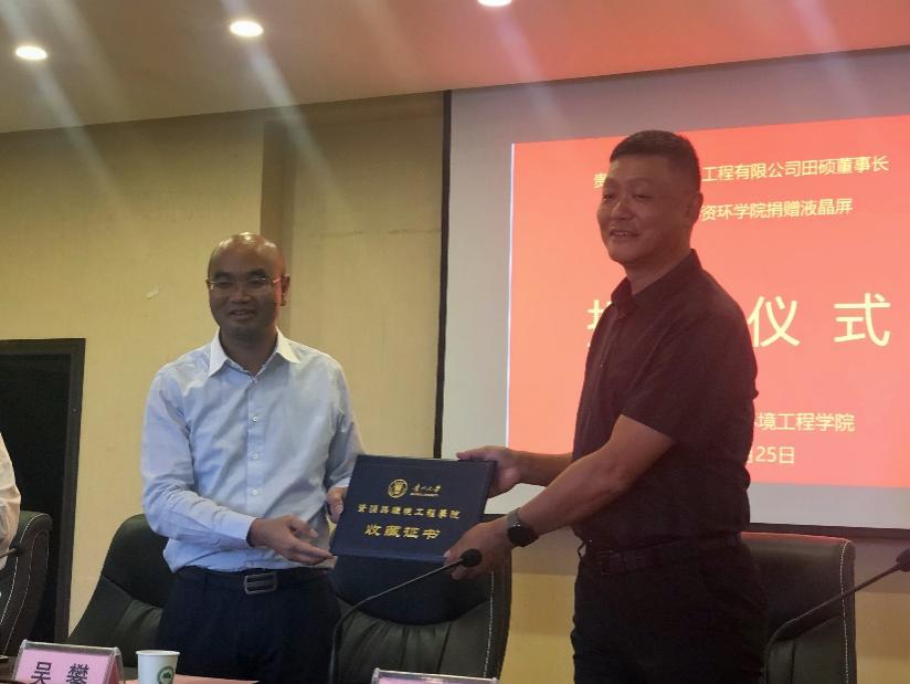 4月25日,贵州黔咨勘岩土工程有限公司向我院捐赠液晶屏仪式在436报告厅举行。出席捐赠仪式的领导和嘉宾有贵州黔咨勘岩土工程有限公司董事长、87级校友田硕,贵州大学副校长吴攀教授,院党委书记李波,喀斯特地质资源与环境教育部重点实验室副主任吴起鑫教授,贵州黔咨勘岩土工程有限公司郑丽、殷浩崧工程师,学院陈世万、王勇、吴道勇老师,地质类专业80余名本科毕业生参加了本次活动。捐赠仪式由左双英老师主持。