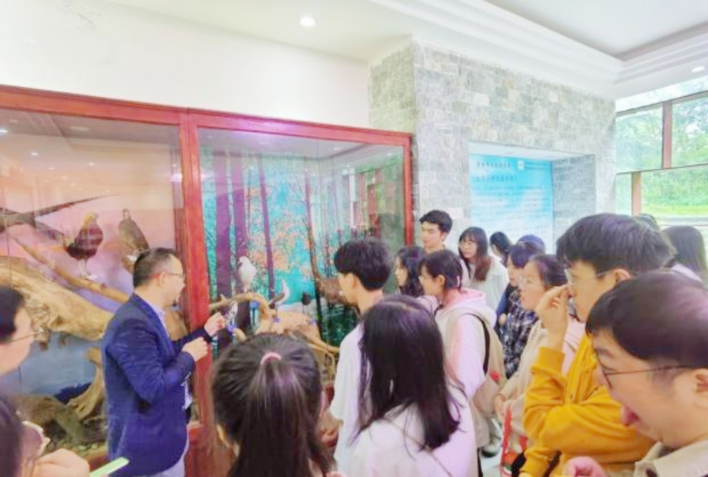 在了解了生物多样性后,同学们跟随吴老师的步伐,在沿途的生态介绍和讲解中走进了室内科普馆。在这里,陈列着各种动、植物的标本,杨爱江老师带领同学们挨个讲解、参观。在参观结束后,大家来到了报告厅。在这里,杨老师还特意拿出自己珍藏的化石——“贵州龙”,给同学们进行讲解,并让大家有机会近距离观察。