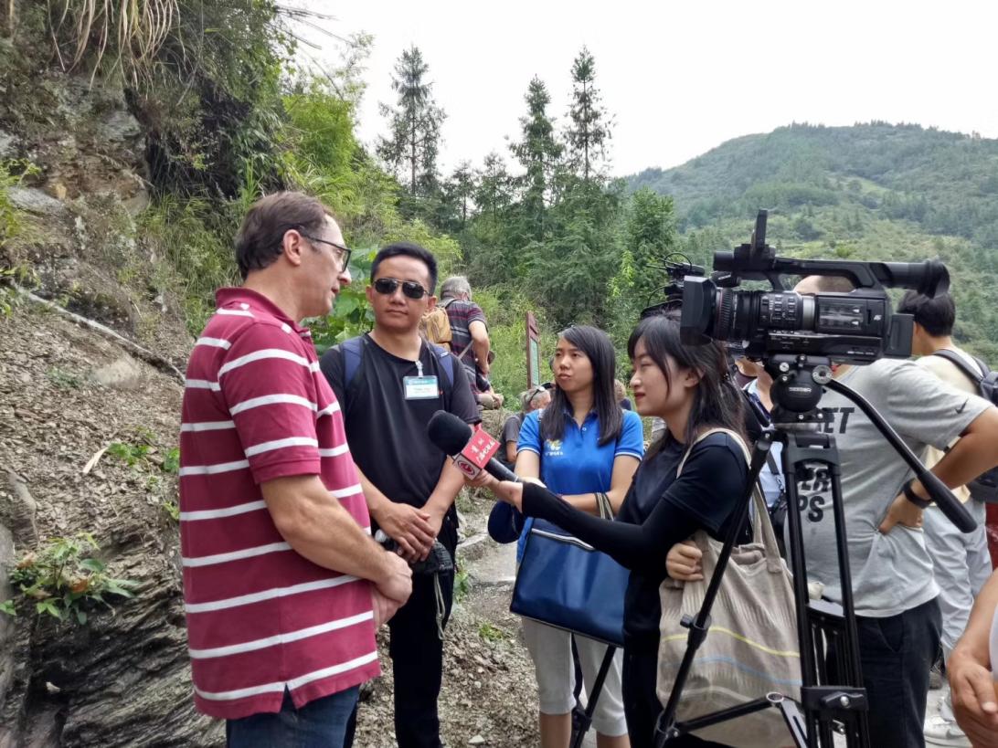 7  2018818日,杨宇宁副教授(左二)与时任寒武系分会主席、美国俄亥俄州立大学Loren E. Babcock教授(左一)在寒武系苗岭统和乌溜阶“金钉子”剖面接受媒体现场采访