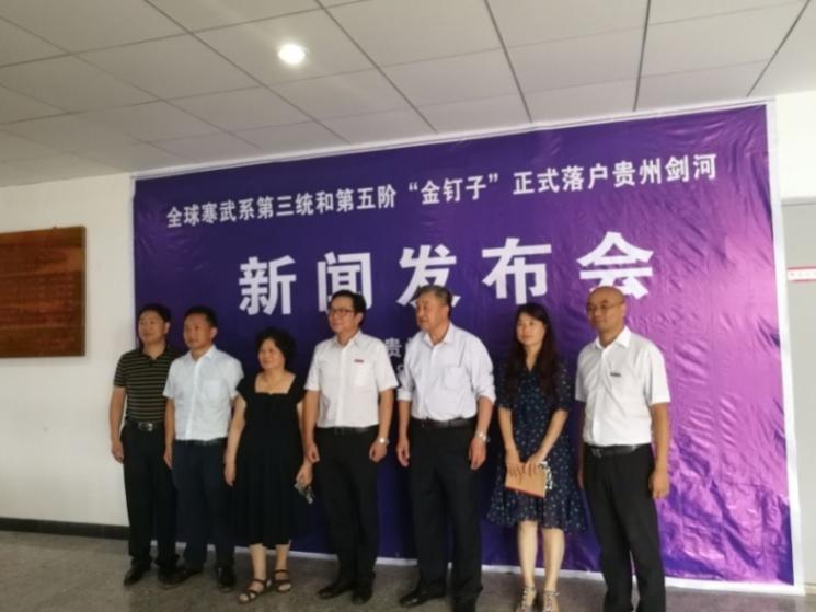6  201875日,贵州大学召开全球寒武系第三统和第五阶“金钉子”正式落户贵州剑河的新闻发布会,学校、学院领导与研究团队成员合影(左起:时任资环学院党委书记滕召华老师、杨宇宁副教授、彭进教授、贵州大学党委书记李建军教授、赵元龙教授、杨兴莲教授、时任资环学院院长吴攀教授)