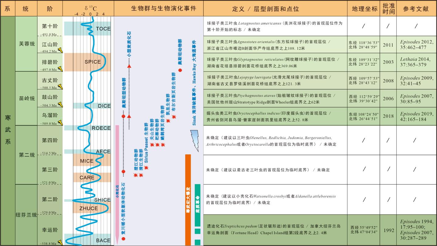 2 寒武系年代地层划分与“金钉子”(GSSP)、寒武纪重要生物群产出层位、重要地质和生物事件