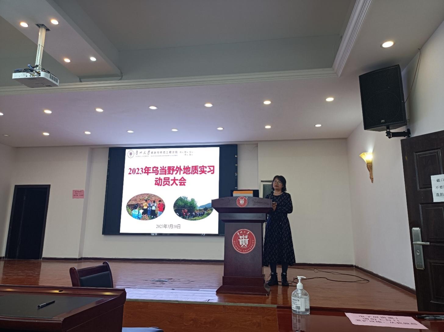 会议伊始,首先由李波书记为动员大会致辞,她指出乌当野外地质实习是一次巨大的挑战,在长达8周的实习过程中同学们各方面将得到很好的锻炼,希望同学们珍惜机会,认真对待。在野外实习过程中,要听从带队老师的安排,将实践与理论结合。同时,要将安全放在首位,注意人身和财物安全以及饮食安全,并严格遵守实习纪律,防止各种事故的发生。
