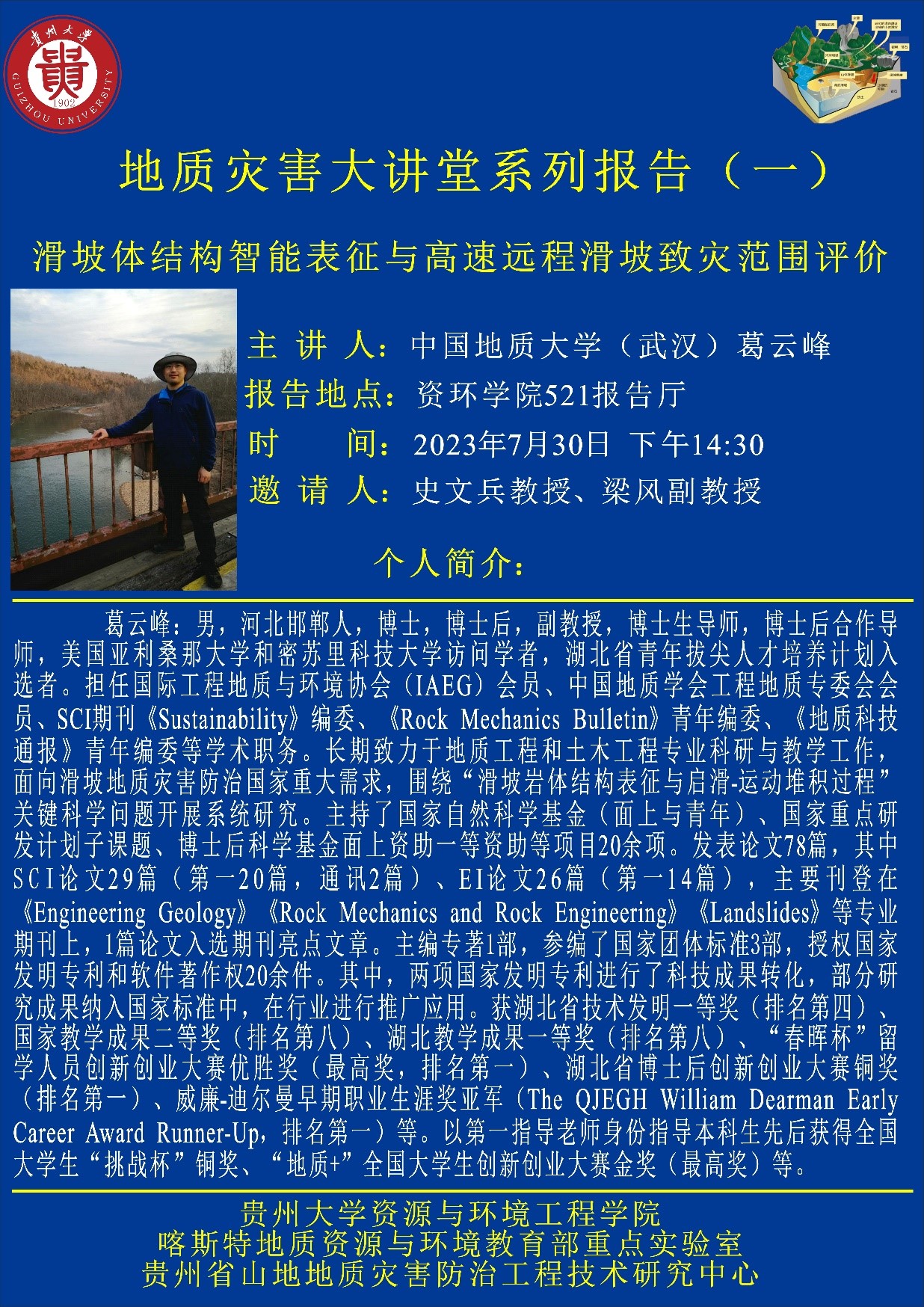 2023年7月30日,中国地质大学(武汉)葛云峰教授受学院史文兵教授、梁风副教授邀请,在资环学院521报告厅做了一场精彩报告,报告以“滑坡体结构智能表征与高速远程滑坡致灾范围评价”为详细介绍葛教授近十年来所开展的一系列工作,高速远程滑坡灾害频发,以点云数据为输入量,基于人工智能算法建立岩体结构智能识别模型是精细化表征滑坡结构的重要手段,葛云峰教授报告内容丰富、研究深入,为老师们和同学们带来了一场高水平的学术讲座。