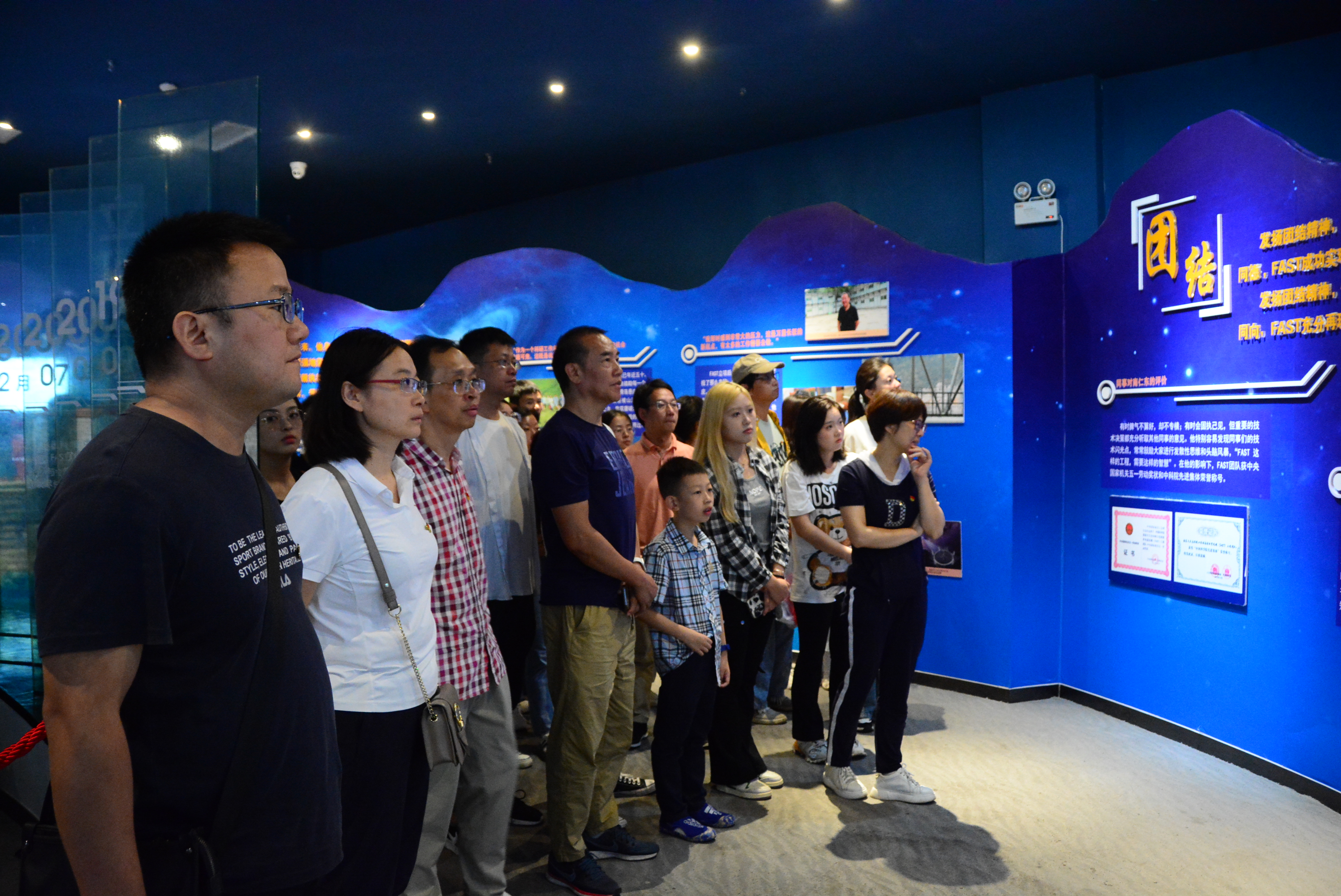 上午,党员同志们首先参观了“时代楷模”南仁东先进事迹馆。从讲解员的介绍中可知,“天眼”项目的选址、论证、立项、建设,每一步都实属不易。为亲自测量工程项目的误差,南仁东先生带着团队攻坚克难,不断创新,解决了一个又一个的难题。他22年扎根深山铸造大国重器,带领团队经历近百次失败,终获成功,建造出了世界最大最灵敏的单口径射电望远镜。当大家登上“天眼”观景台时,都被引以为荣的“国之重器”——FAST震撼,同时也更深切地感受到南仁东先生一生报效祖国的崇高精神。