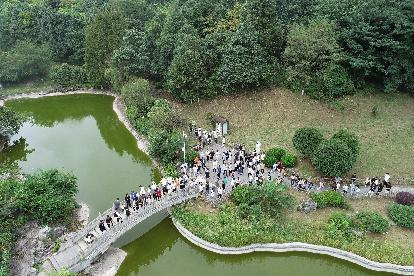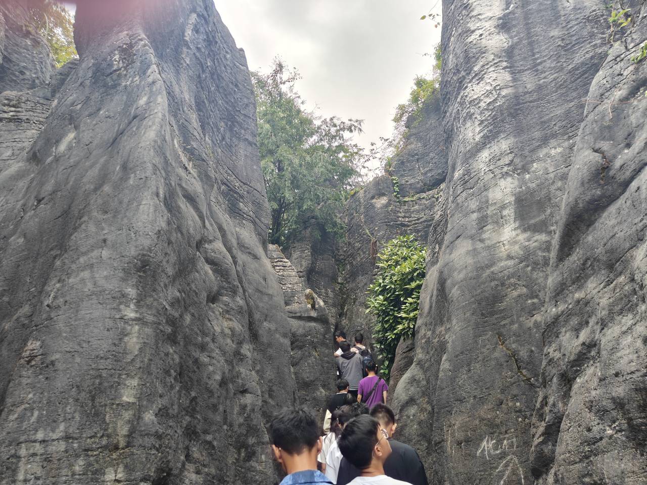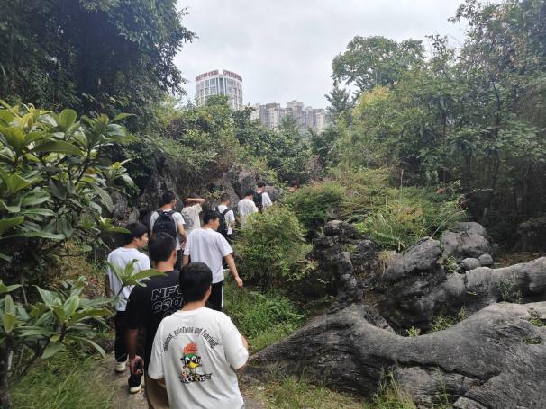 贵阳喀斯特公园位于贵阳市观山湖区金阳南路与奥兴路之间,占地约450亩,公园内天然的石林景观是在工程建设过程中偶然发现的两片自然石林,还分布有典型的一线天、石林飞瀑等地貌,园中道路蜿蜒,嵯峨秀石,千姿百态,绮丽多姿的喀斯特景观在国内城市中心区首屈一指,是贵阳城市会客厅和难得的“城中盆景”。同学们一边感叹大自然的鬼斧神工,一边听老师讲解三叠系地层喀斯特地貌形成演化机理以及喀斯特地质对工程的影响,纷纷表达了想用专业理论和知识解释自然现象、解决地质资源与地质工程问题的强烈愿望。