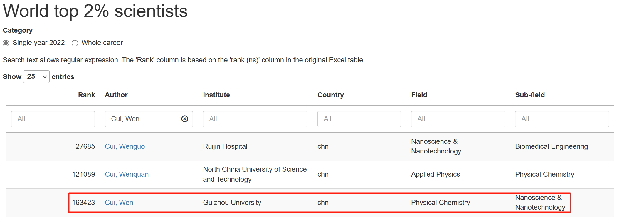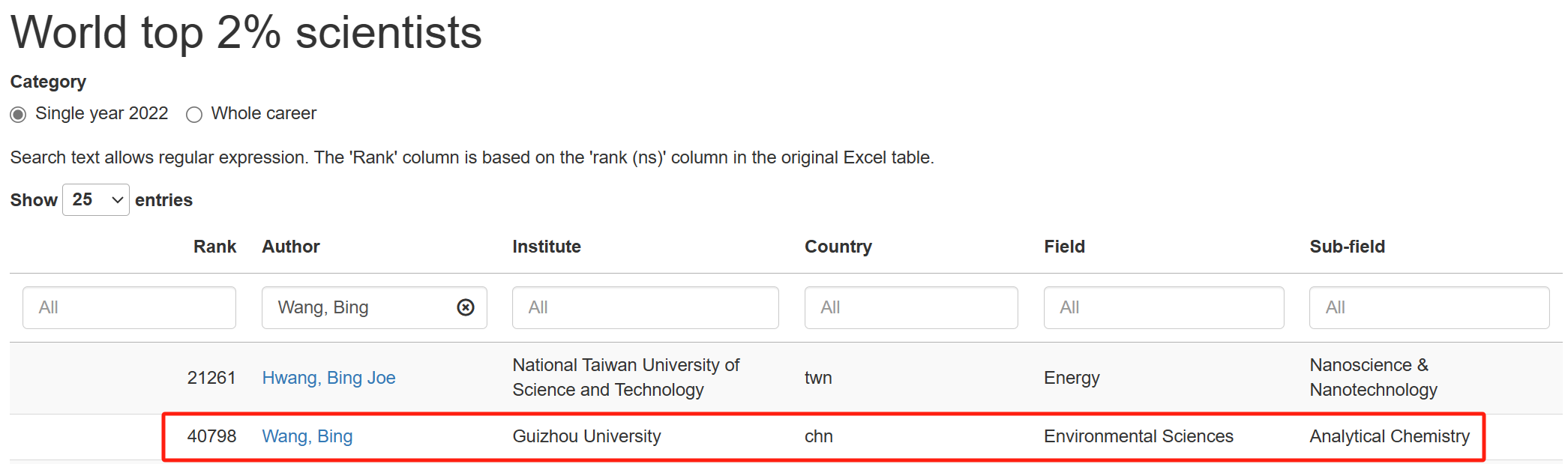 该榜单基于Scopus数据库,依据全球约一千万科学家的论文引用数、h指数、合著者调整的hm指数、单独或第一作者的文章引用数等综合参数进行综合评估,收录了来自22个学科领域、176个子学科领域全球排名2%的科学家,反映科学家的产出量和学术影响力。