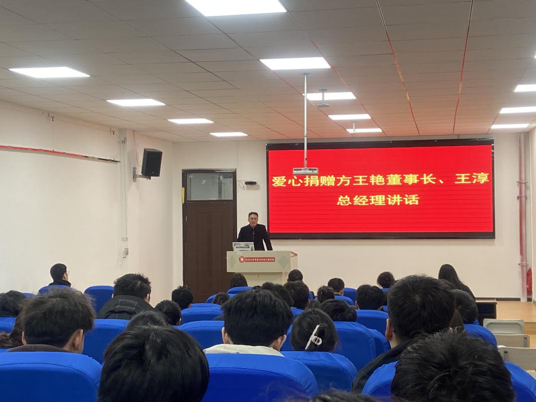 爱心捐赠方贵州黔禹建设工程有限公司王淳总经理首先向促成本次捐赠协议的付勇副院长表达了感谢,以自身的成长之路和人生经历为切入点,告诫大家要珍惜当下这来之不易的学习机会和如此宝贵的学习资源和环境。王淳总经理谦逊表示,他和我们广大学子一样,始终在路上,学习和成长永无止境,祝愿资环学子都能拥有一片光明的未来,成长成才,报效祖国。
