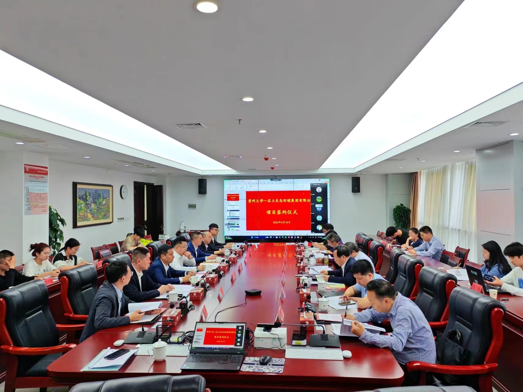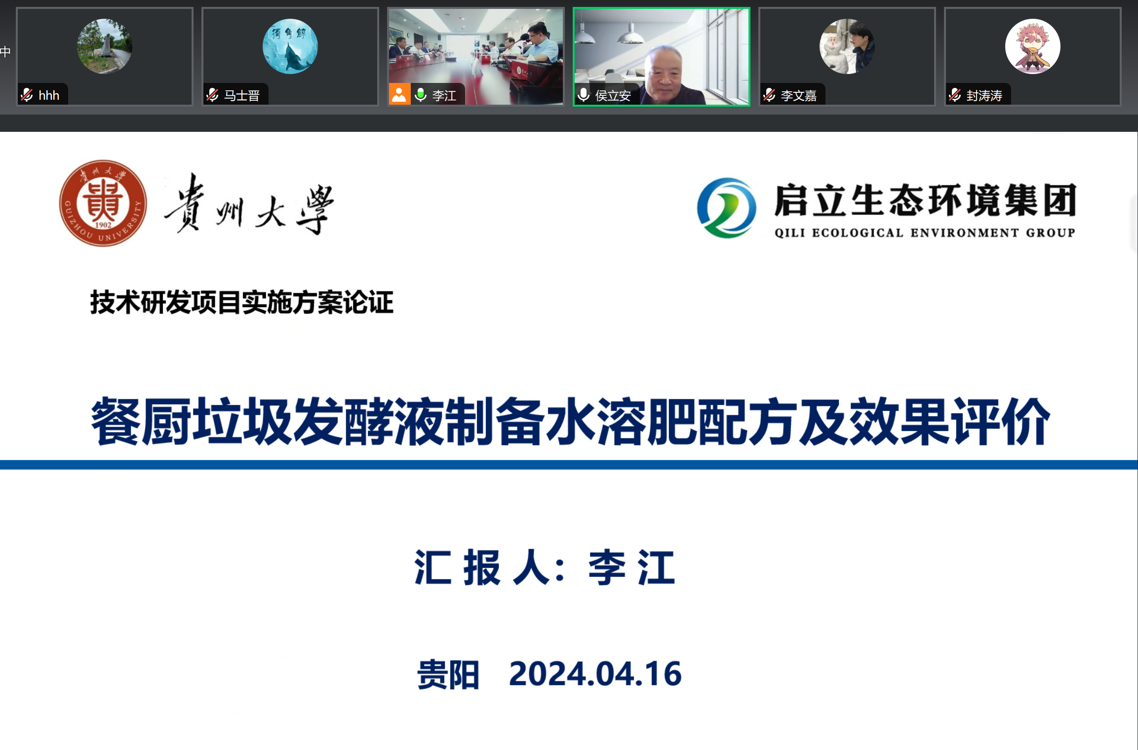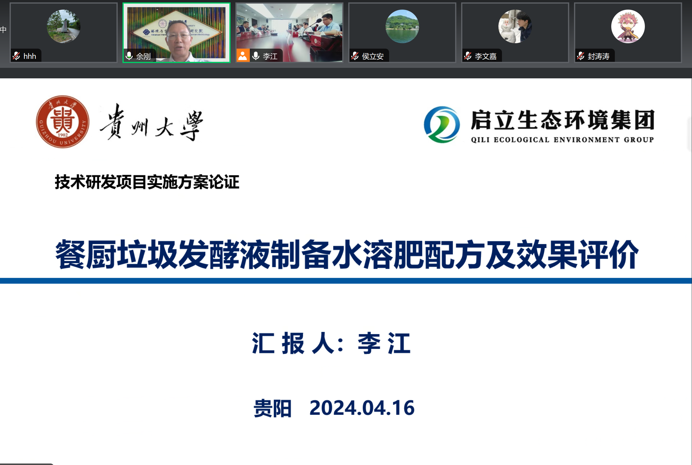 2024年4月16日,由贵州大学资源与环境工程学院承办的贵州大学与启立生态环境集团有限公司校企合作项目“餐厨垃圾发酵液制备水溶肥配方及效果评价”签约仪式暨实施方案论证会在贤正楼1号楼202会议室召开,会议采用线上线下结合方式召开,中国工程院院士、贵州大学校长宋宝安担任专家组组长,侯立安院士、余刚院士、周少奇教授、陈超教授、吴复忠教授、付勇教授、刘方教授组成专家组,学院党委书记李波教授、易广控股集团深圳公司总经理梁正邦、启立生态环境集团有限公司总裁高保中等领导出席,项目负责人李江教授、项目成员李彦澄教授、王斌特聘教授及相关人员30余人参加会议。