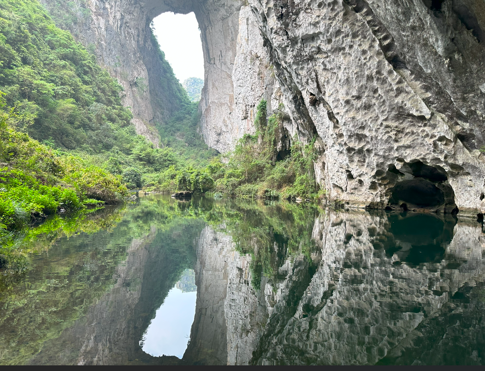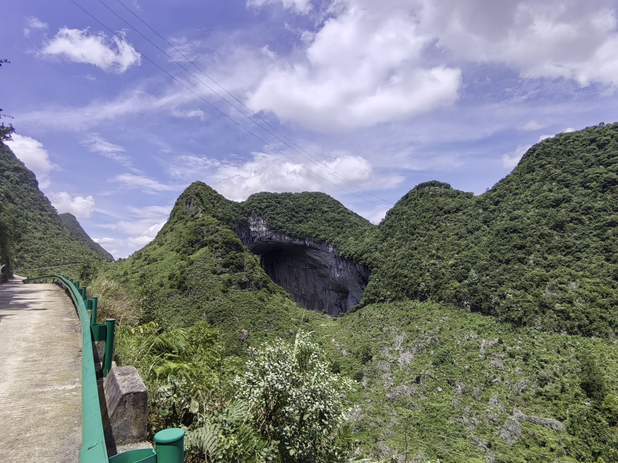 接着,蒋玺和陈世万带领实践队队员们前往“大圣之眼”,由蒋玺为队员们进行讲授其形成此景观的原因。从空中看天门洞周围,发现这里是座椭圆形大型天坑,是地下溶洞坍塌后所形成。附近几公里,有几处较大天坑,在天坑溶洞群的下游有水流,是由于长期的溶蚀作用所致,随着时间的推移,地表的部分溶洞因为地质构造的变化或溶洞顶部的坍塌而形成天门洞。“大圣之眼”景观的形成,是天门洞与溶洞、地下河相结合的产物。