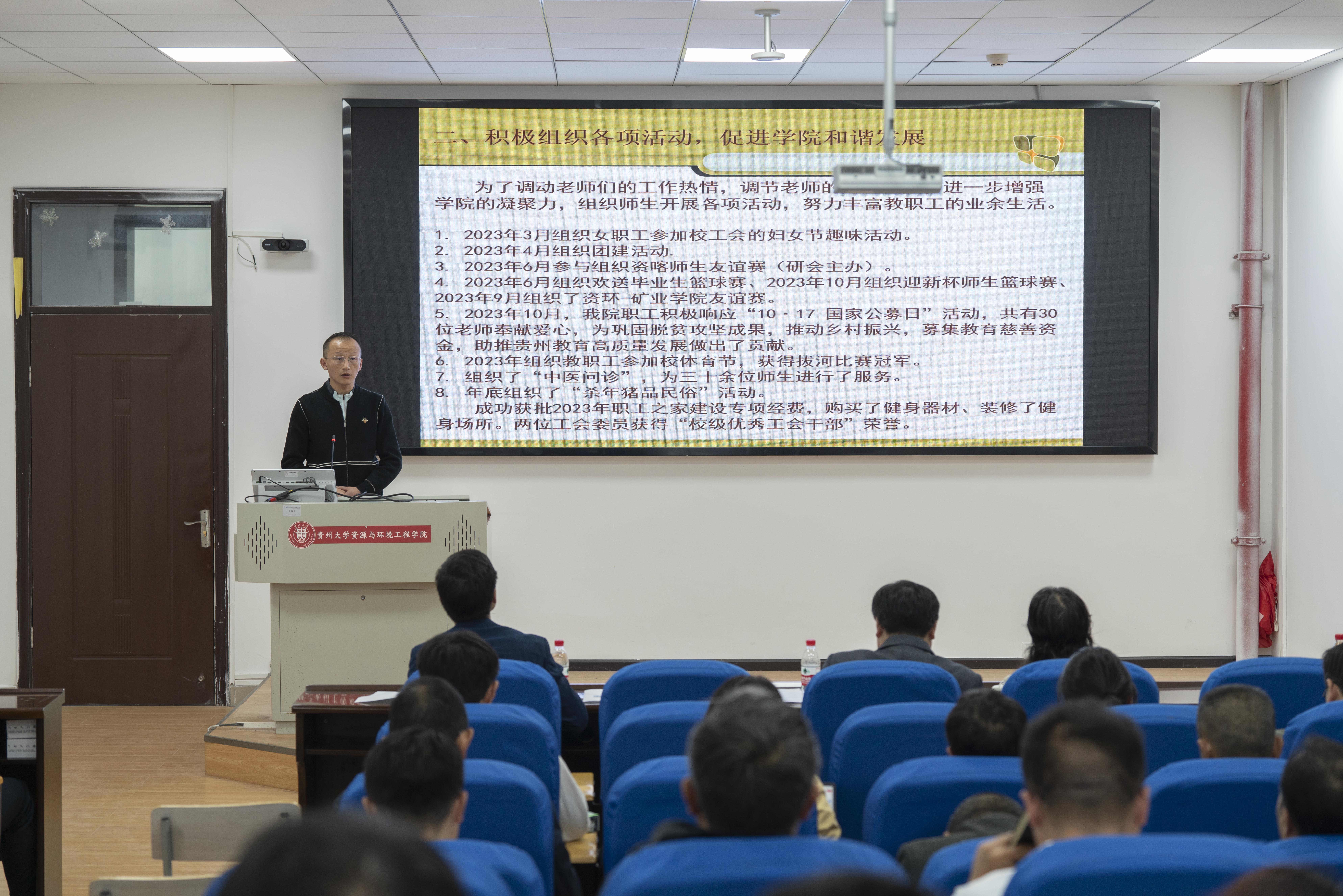 学院分工会副主席王勇作了《2023年资源与环境工程学院工会工作报告(含财务报告)》,分别从落实民主权利、工会活动开展、工会人文关怀和财务支出等方面汇报了2023年以来工会工作成效和未来努力的方向。
