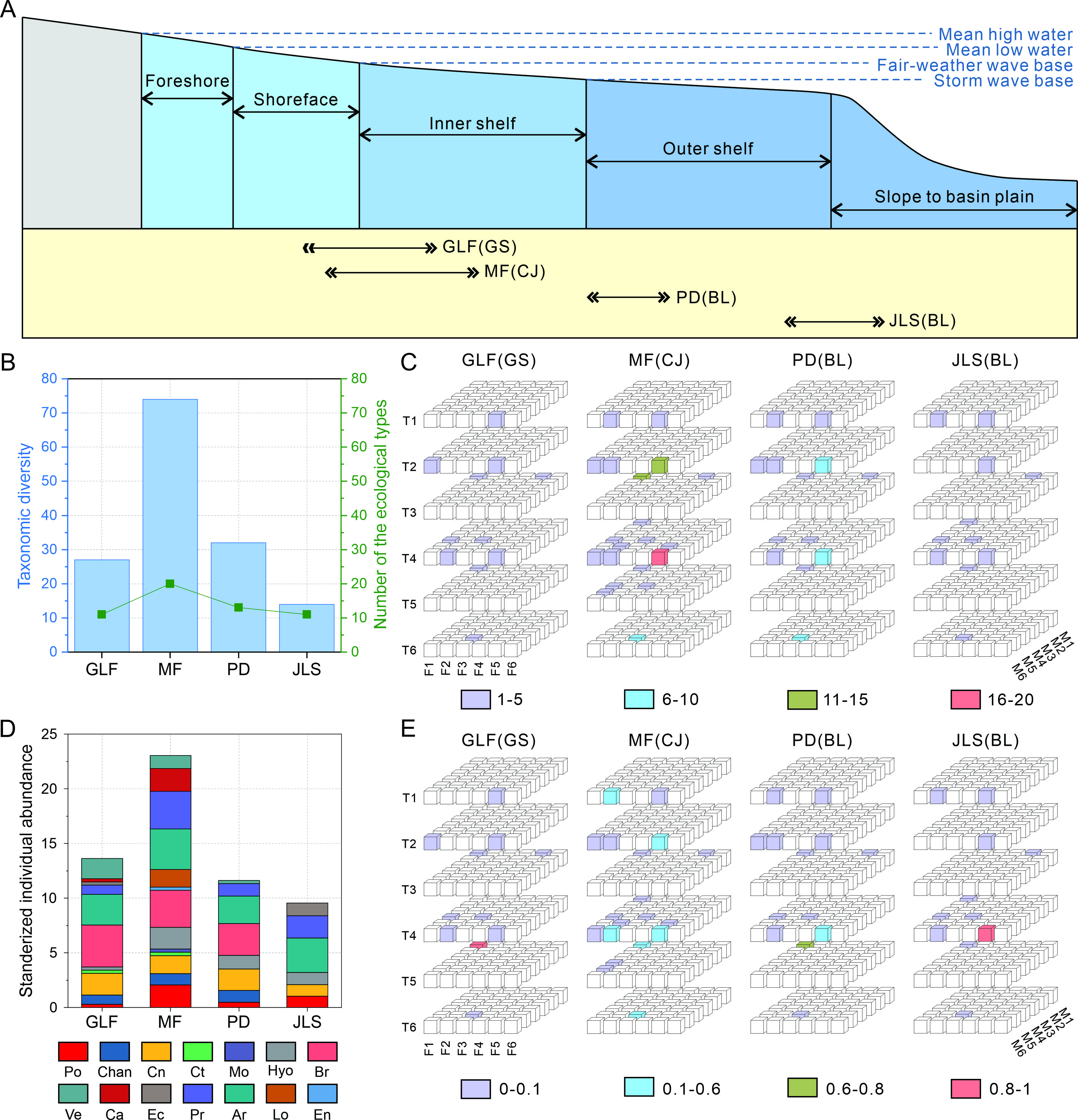 此前,杷榔生物群的相关研究工作主要集中于系统古生物学,群落的定量研究相对匮乏,限制了研究人员对寒武纪海洋群落时空差异的理解。针对这一问题,研究团队在麻江地区开展了广泛的野外踏勘和化石采集工作,在麻江平定村西侧的杷榔组中新发现了软躯体化石的产出层位(图1)。这个新的化石产地产出有多种精美的化石,包括海绵动物、开腔骨类、刺胞动物、软舌螺类、腕足动物、节肢动物、古虫动物和鳃曳动物等(图2)。与杷榔生物群其它化石产地相比,平定化石群落是一个以腕足动物为主导的古海洋群落,同时伴有多样化的节肢动物。在此基础之上,研究团队进一步系统整合了杷榔生物群近二十年来的群落数据,通过开展详细的对比研究,发现杷榔生物群不同化石产地的物种组成具有很高的异质性。此外,平定化石群落也填补了远滨与斜坡环境之间的生境空白,为研究造成古生物群落组成差异的因素提供了新的证据(图3)。总体而言,这些发现揭示了杷榔生物群的高度的群落复杂性,展现了寒武纪大爆发之后海洋群落生态空间利用情况随环境梯度变化的细节。