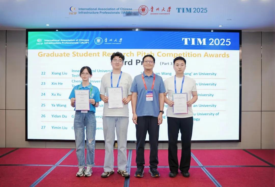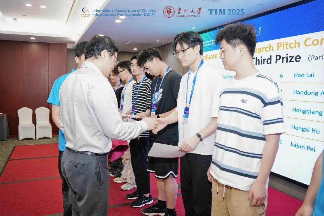 TIM国际交通基础设施大会闭幕式在热烈掌声中结束。闭幕式由贵州大学史文兵教授进行主持,IACIP前主席Jenny Liu教授进行会议总结,并由南佛罗里达大学Qing Lu教授、南阿拉巴马大学Shenghua Wu教授、南卡罗来纳大学Yu Qian教授、加州州立大学Dingxin Cheng教授、香港理工大学Yuhong Wang教授、伊利诺伊大学厄巴纳-香槟分校Erol Tutumluer教授为表现优异的研究生科研快讲竞赛获奖者颁奖。