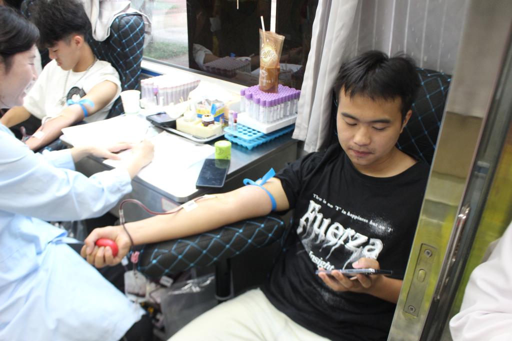 在义务献血现场,同学们纷纷排队献血。他们表示,献血是社会责任和担当,更是爱心的传递。尽管天公不作美,时有细雨飘落,挡不住同学们高涨的热情,都希望通过自己的行动,为社会贡献一份力量,帮助更多需要的人。