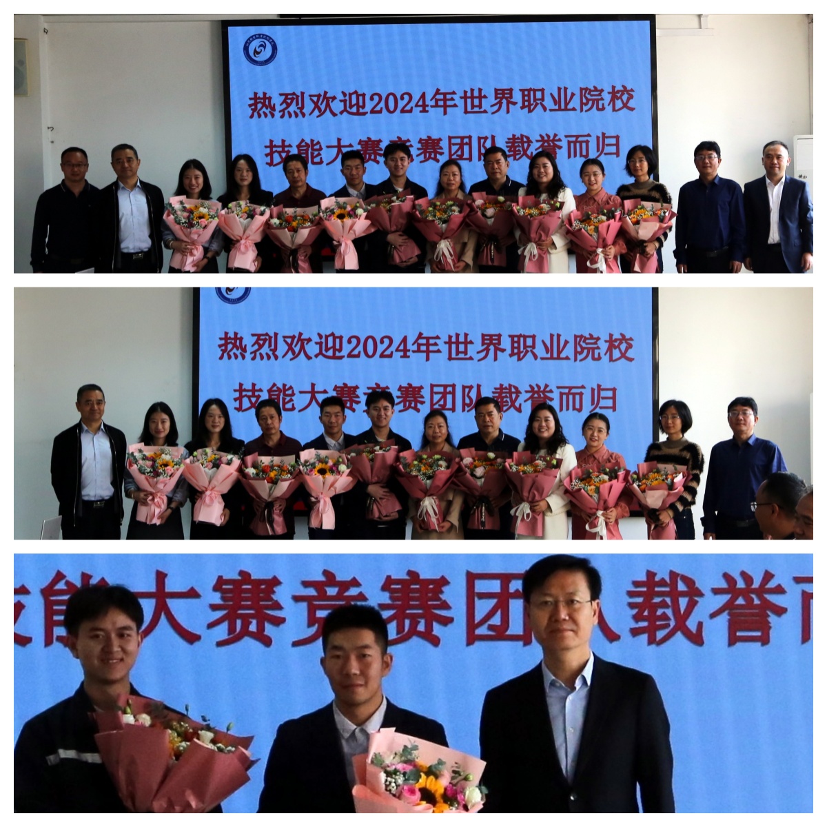 座谈会开始,校领导宋明华、王光涛向指导教师团队送上鲜花表示热烈祝贺并合影留念;满海波向参赛学生代表送上鲜花,祝贺取得优异成绩并合影留念。宋明华、王光涛还与全体竞赛团队师生合影留念。会场响起热烈掌声。
