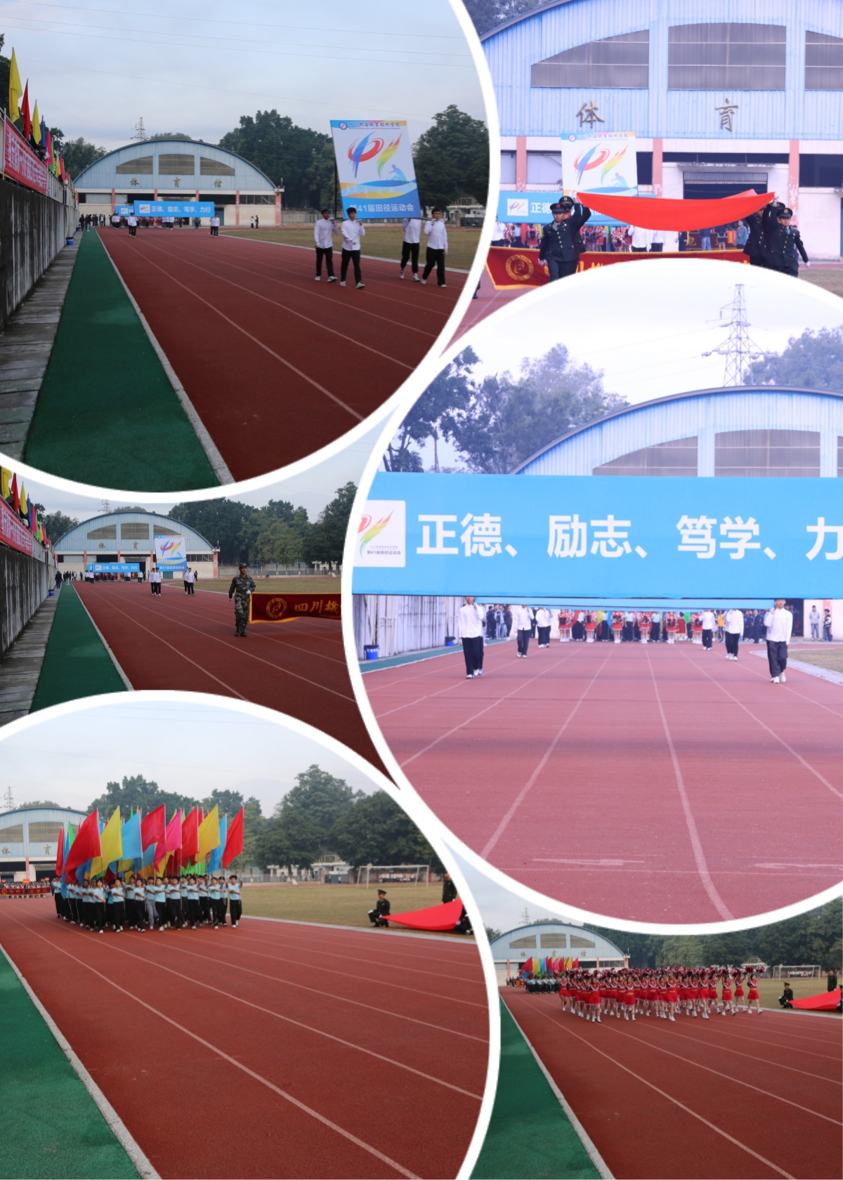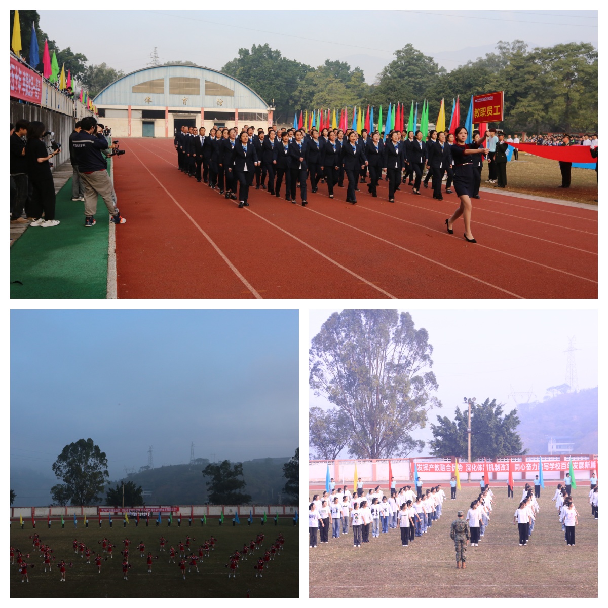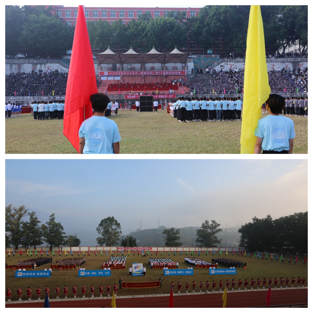 初冬的校园,阳光和煦、风轻云淡。运动场内彩旗飘扬,大型横幅“发挥产教融合优势,深化体制机制改革,同心奋力谱写学校百年发展新篇章!”、“每天锻炼一小时,健康工作五十年,幸福生活一辈子”格外醒目,气氛欢快热烈。上午8时20分,陈勇宣布学校第41届田径运动会开幕式开始,在鲜艳五星红旗、校旗、运动会徽标、校训及运动会主题横幅引领下,伴随运动员进行曲鲜花方队、彩旗方队和各二级学院方队入场,依次通过主席台接受检阅。通过主席台时,各二级学院代表队还排演简短健身操展示青春活力与风采,同贺学校第41届运动会开幕。入场式最后,60名教职工统一身着藏青色西服工装齐步通过主席台,齐声高呼“坚守初心,立德树人;甘为人梯,助力成才”,表达了全体教职员工心声,收获了最为热烈的掌声和欢呼声。