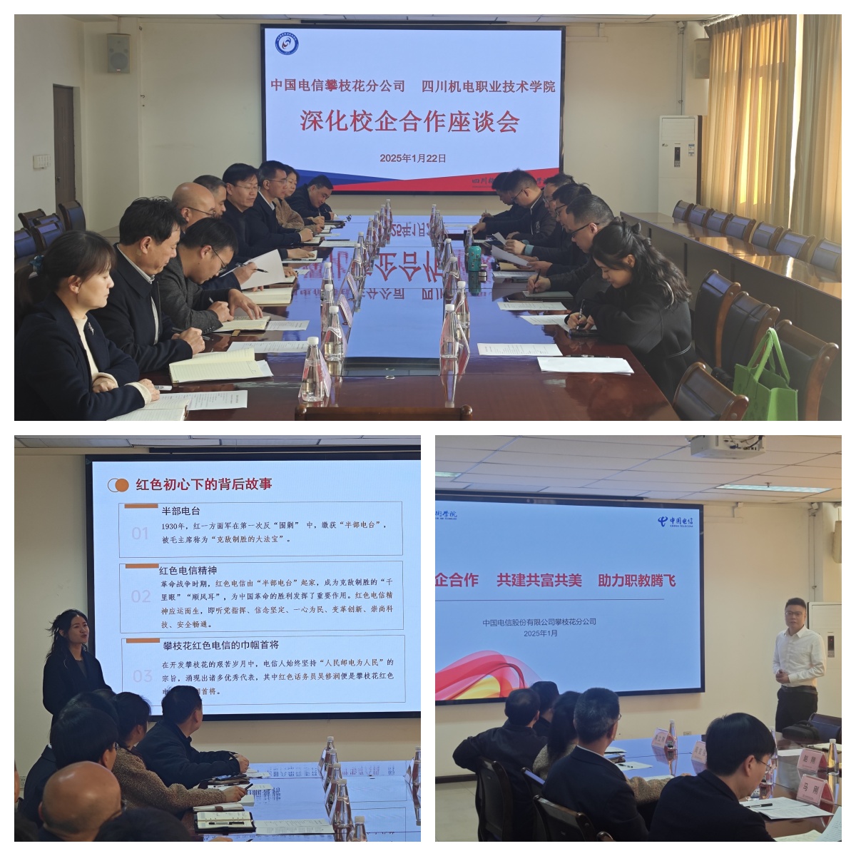 中国电信攀枝花分公司介绍了公司的发展历史和企业文化。校园部负责人详细介绍了攀枝花分公司负责学校“智慧校园”项目试运营情况以及未来合作规划。双方围绕智慧校园运营、师生智慧校园使用、未来合作方向等展开了深入交流讨论。