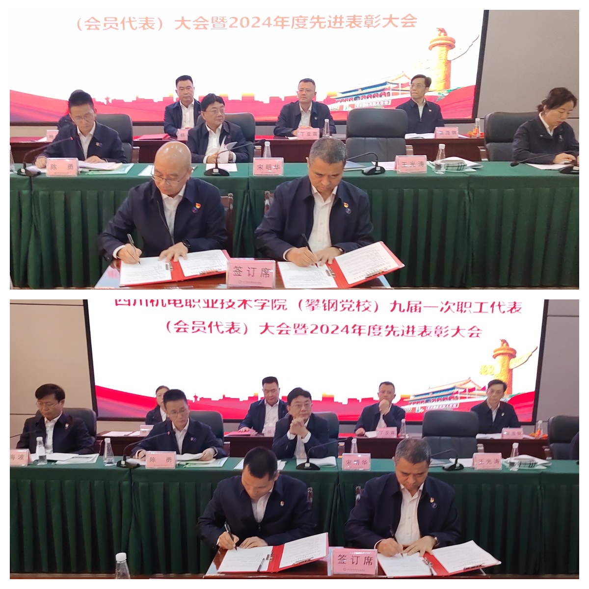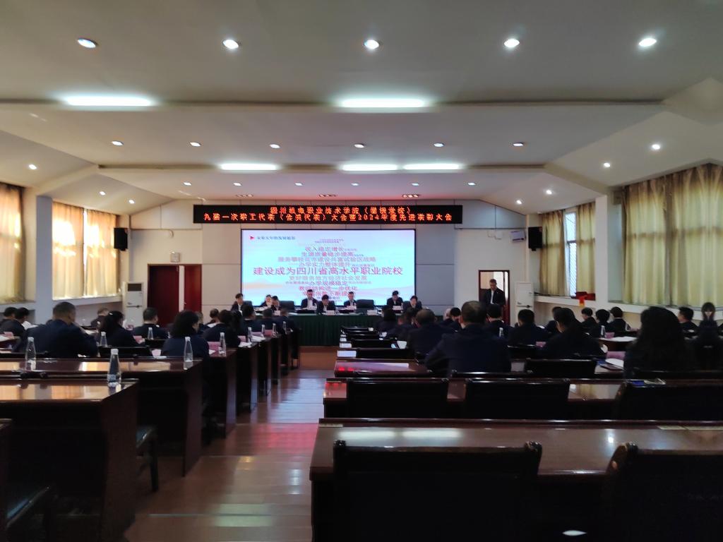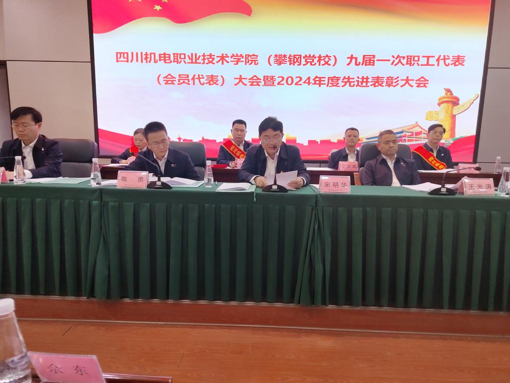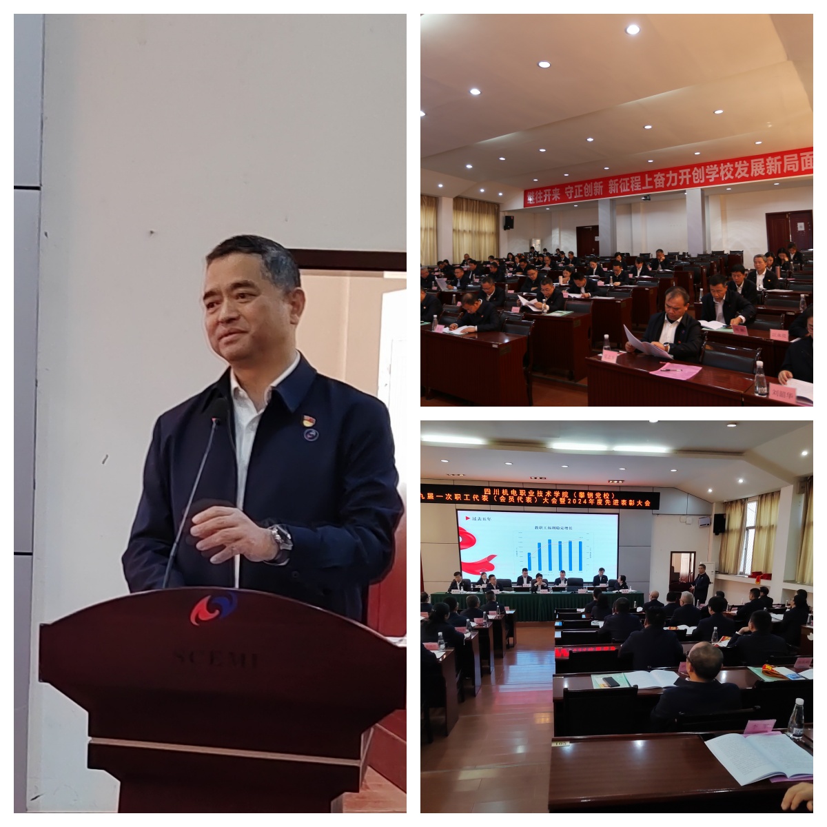 (综合管理部马琪)初春的校园阳光明媚、和风温煦,火红的攀枝花映红美丽的校园,学术报告厅一楼大厅庄严热烈,大型横幅“继往开来、守正创新,新征程上奋力开创学校发展新局面”凸显主题,大厅外墙的“初心如磐担使命,奋楫扬帆启新程”格外醒目。今日(21日)下午,学校九届一次职代会(九届一次工会会员代表大会)暨2024年度先进表彰大会在这里隆重召开,60余名代表、列席代表汇聚一堂共商学校发展大计。党委副书记、工会主席陈勇主持大会,大会主席团成员校领导宋明华、王光涛、姚春早、满海波以及丁亚霖、杨春城、张浩钢、杨莉华在主席台就座。大会号召,全体干部职工要高举习近平新时代中国特色社会主义思想伟大旗帜,深入学习贯彻党的二十大和二十届二中、三中全会精神,落实上级党政各项部署,坚定信心保目标、抢抓机遇谋发展,凝心聚力、奋力拼搏,全方位推进学校可持续发展,新征程上奋力开创学校发展新局面!