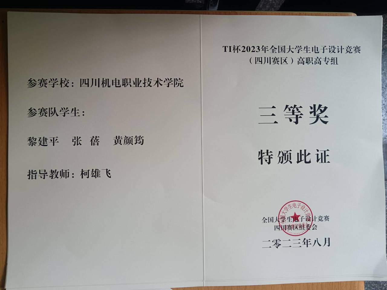 (自动化学院柯雄飞)日前,2023年TI杯全国大学生电子设计竞赛组委会公布大赛成绩,我院自动化学院2021级电子信息技术专业张蓓、电气自动化技术学生黄彦筠、供用电技术专业学生黎建平组成的参赛团队获得高职组三等奖,这也是我院第二次在该赛项中获奖。