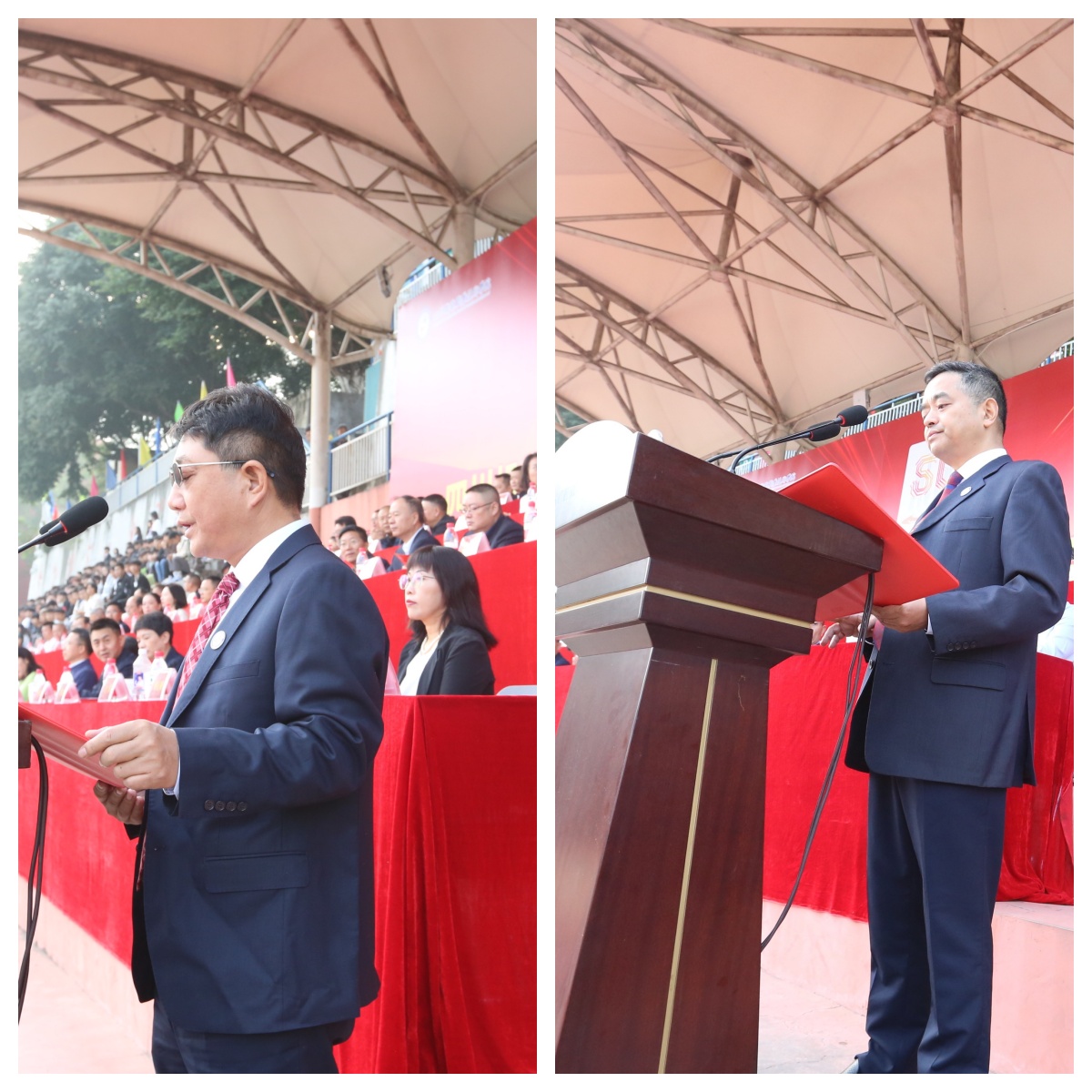 (综合管理部马琪)11月8日学校迎来办学50周年。秋日的攀枝花阳光明媚,美丽的校园花草飘香,各色彩旗、彩带将校园装点得格外喜庆。马家田校区运动场上的大型横幅“五十载风雨兼程德渥群英 新征程踔厉奋进为国育才”“五十风雨铸辉煌 根植裂谷写华章”“五十载桃李满天 新征程春晖四方”等分外鲜明,彰显50年豪迈与成就。在这个喜庆的日子,学校在马家田校区运动场举行庆祝大会,隆重庆祝学校办学50周年。四川省委教育工委委员、教育厅党组成员、副厅长石静,攀枝花市人民政府党组成员、副市长许军峰,攀钢集团有限公司党委常委、副总经理、总会计师王从庆出席庆祝大会祝贺学校办学50周年。学校党委书记宋明华主持庆祝大会、院长王光涛致辞。