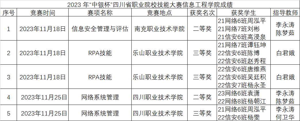 (综合管理部马琪、信息工程学院李永涛)11月18日—24日,2023年四川省“中银杯”职业院校技能大赛(高职组)信息安全管理与评估赛项、网络系统管理赛项、RPA(机器流程自动化)赛项等3个赛项,在省内有关职业院校开赛,学校信息工程学院派出学生竞赛团队分别参赛,均收获二、三等奖,充分展示了学校有关专业办学水平和实力。