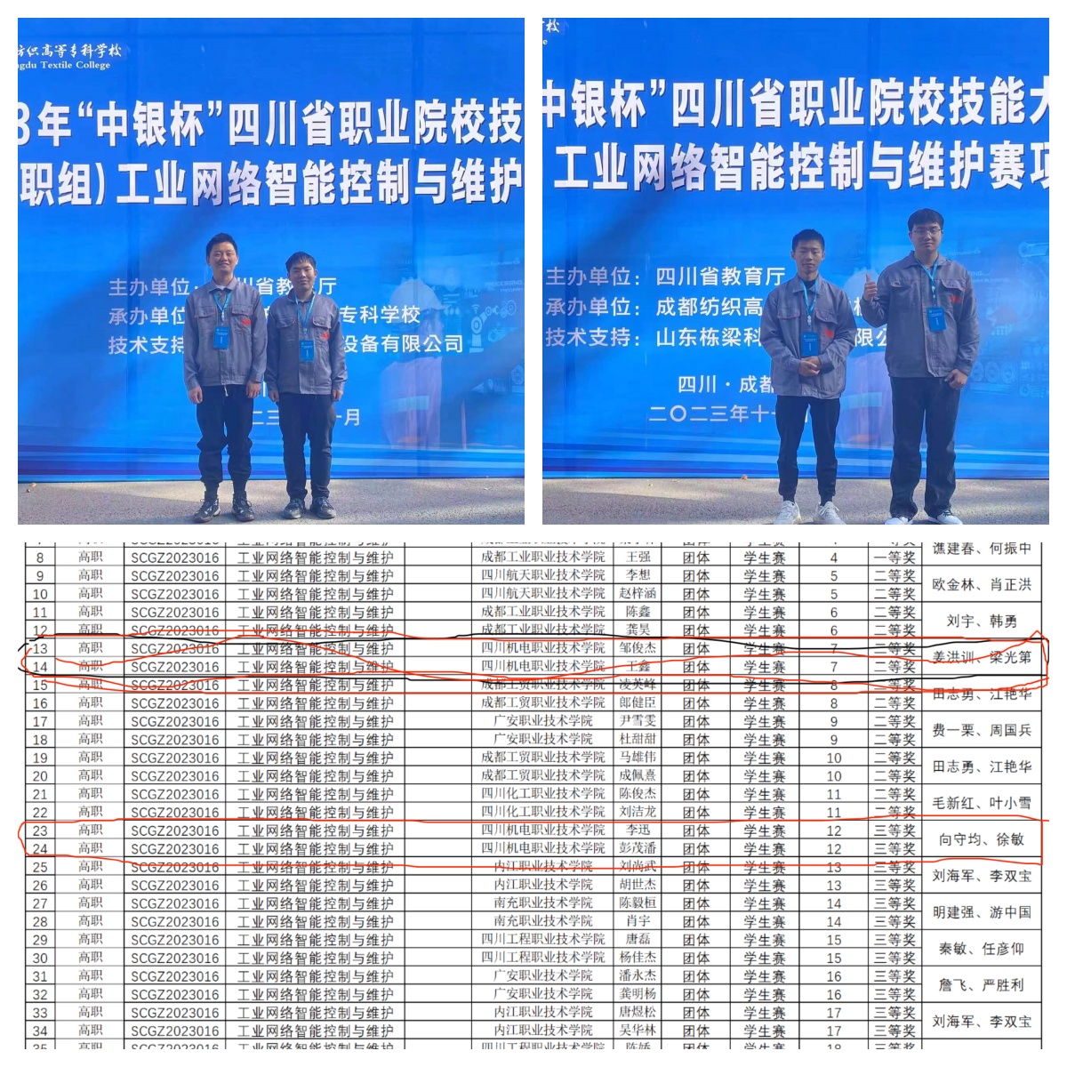 (自动化学院 杨静)日前,“中银杯”四川省职业院校技能大赛“工业网络智能控制与维护”赛项举行,由向守均、姜洪训、徐敏和梁光第等3位老师担纲指导的学校自动化学院周俊杰、王鑫和李迅、彭茂潘等2个学生竞赛团队,分别获得二等奖、三等奖。至此,学校入围“中银杯”各赛道决赛的学生竞赛团队全部获奖。