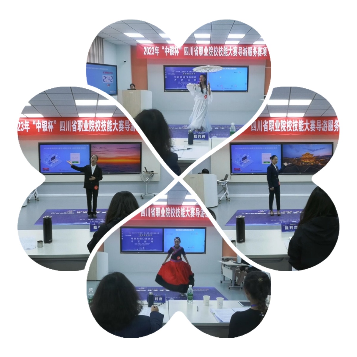 四川省职业院校技能大赛是由四川省教育厅主办,按年度举行的专门面向省内职业院校的大型综合性赛事,具有规格高、赛项全、选手多、竞争强的特点。此次“中银杯”(高职组)导游服务赛项更是对标国赛,采用了全新的赛程与赛制。整个比赛包括导游英语口语测试、才艺运用、现场导游词创作及讲解、自选景点导游讲解、导游知识测试等5个部分。