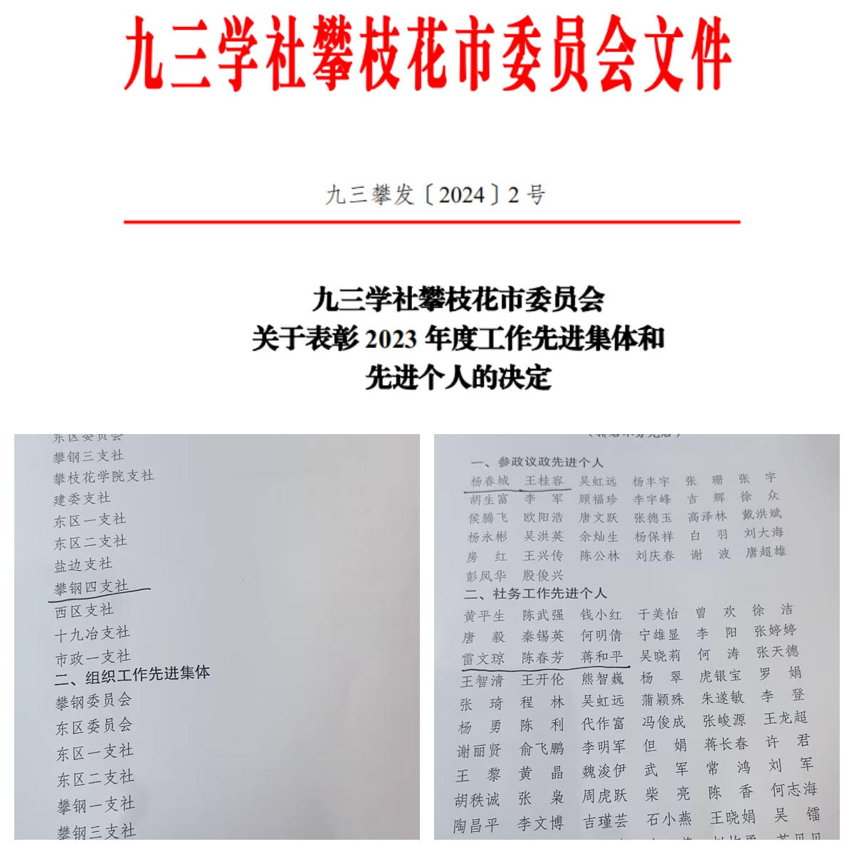 据了解,九三学社攀钢四支社成员以学校教师为主体。2023年该支社在学校党委的领导下,在上级党委统战部门的大力支持下,以习近平新时代中国特色社会主义思想为指导,深入学习贯彻中共二十大精神,坚持正确政治方向,弘扬爱国、民主、科学优良传统,充分发挥九三学社高知密集的优势,立足打造高质量技术技能人才培养高地,广泛开展调研,大力开展有关专题研究,围绕更好服务新攀钢发展战略、服务攀枝花市经济社会发展需要,就推进攀枝花市职业教育改革发展、建设区域职业教育高地培养更多高质量技术技能人才等提出了许多高质量的提案、议案;形成了数个高质量课题成果,得到了上级统战部门的高度肯定,彰显了学校民主党派基层组织建设的成效,提升了学校的社会影响力。在攀钢 2023 年度“爱献做”主题活动中,该支社积极组织成员参加收获多项奖项,其中,该支社主委杨春城的《新专业目录下对接钒钛钢铁全产业链的人才培养模式重构研究实践》荣获一等奖;蒋和平的《建设攀西建筑产业工人培训实训基地的可行性研究》荣获三等奖。同时,学校也荣获攀钢 2023 年度“爱献做”主题活动优秀组织单位。