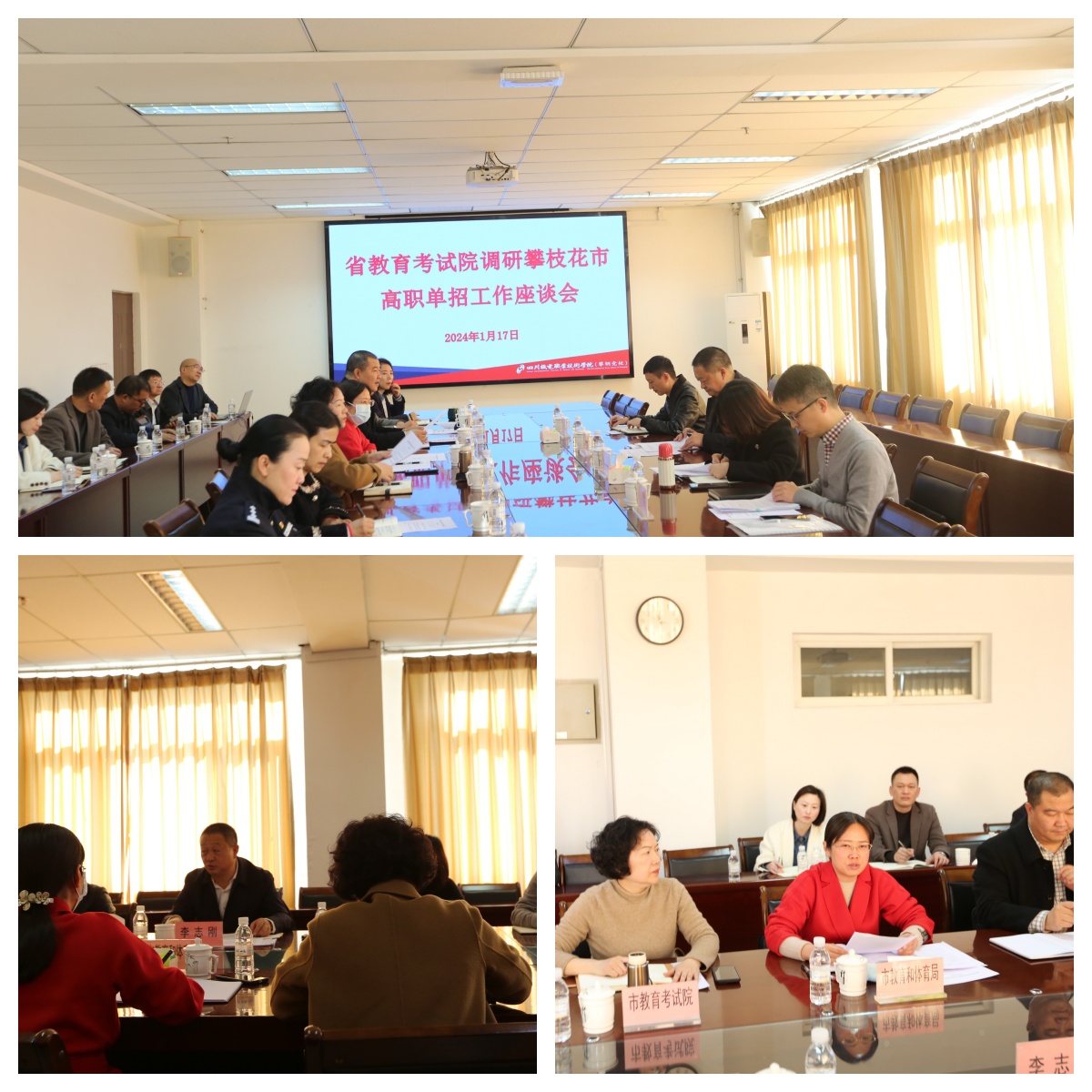 (综合管理部马琪)1月17日上午,四川省委教育工委委员、省教育考试院党委书记、院长李志刚一行,莅临学校调研2024年高职单招工作并召开攀枝花市2024年高职单招工作座谈会。校长王光涛陪同调研并汇报学校标准化考点建设情况,攀枝花市教育和体育局局长李福惠作表态发言。