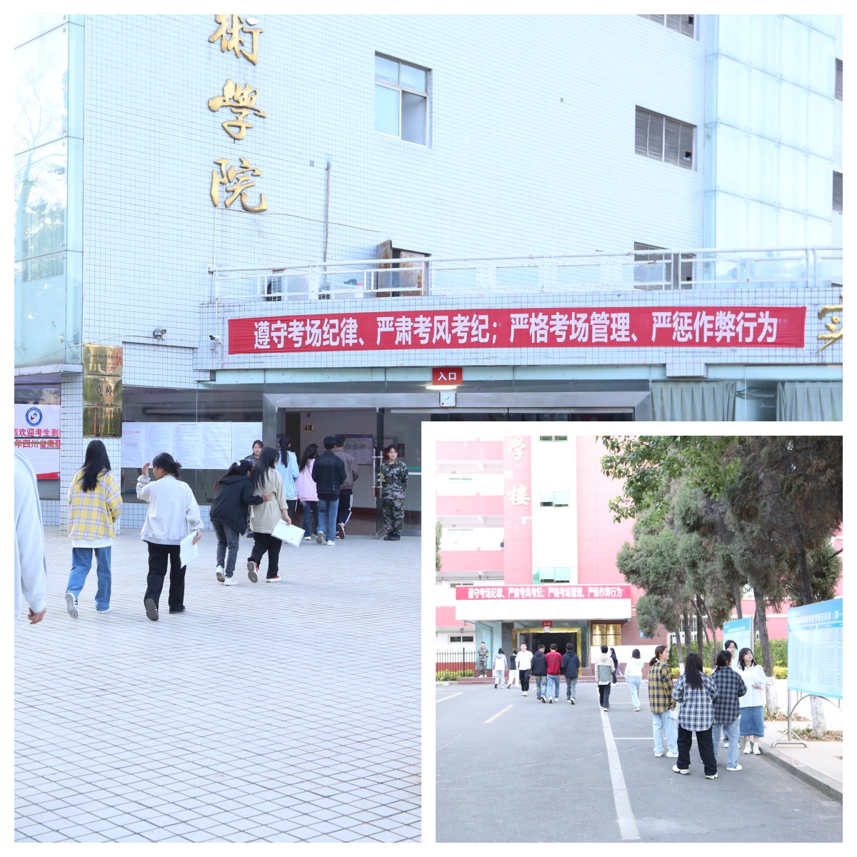 今日(23日)的机电学院教学楼周边彩旗环绕、干净整洁,各种引导牌、指示牌、标识牌、考场分布图等张贴到位清晰明了;3个考区大门上方的大型警示条幅“遵守考场纪律、严肃考风考纪;严格考场管理、严惩作弊行为”格外醒目。早上7点,考点各点位学生志愿者、负责老师和工作人员全部到位。