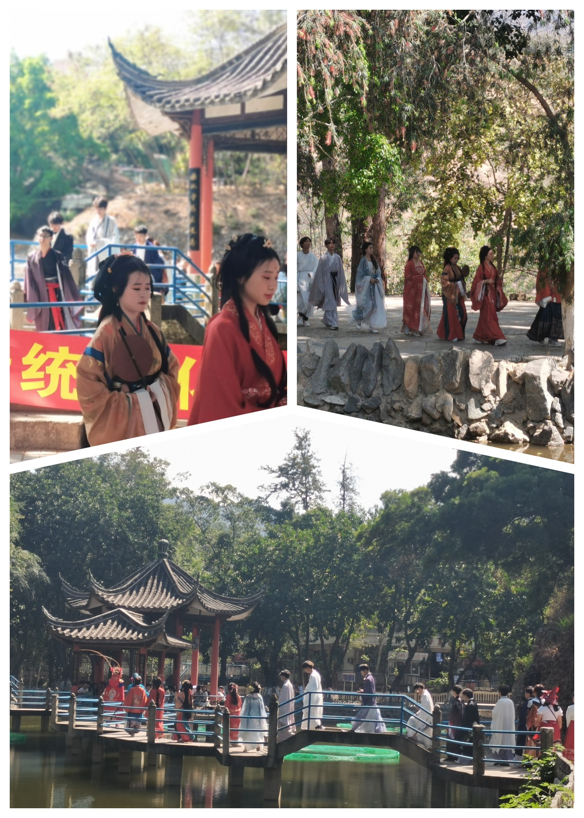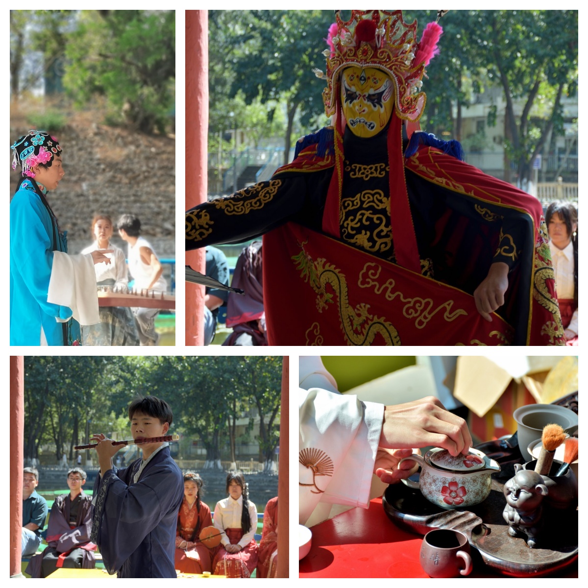 当天下午3时,行知湖畔热闹非凡,游园会如期举行。为了让同学们更好感受传统文化的魅力,活动精心安排了戏曲表演、乐器演奏以及川剧变脸等精彩节目。锁麟囊的婉转唱腔、贵妃醉酒的婀娜舞姿、竹笛的悠扬旋律、古筝的深沉音韵,都让同学们仿佛穿越到了那个风华绝代的汉唐时代。活动期间,还穿插举行了一系列趣味横生的才艺展示和游戏环节,如茶艺展示、国王与天使游戏、诗歌对对碰和摸瞎子等,进一步活跃了现场气氛,同学们在轻松愉快的氛围中深入体验了传统文化的魅力,加深了彼此之间的友谊。这次活动为有相同兴趣爱好的同学们提供了一个展示自我和交流的平台,让他们能够在传统文化的熏陶下共同成长。