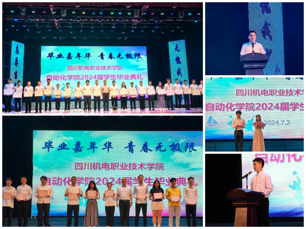(自动化学院学生彭俊鑫)7月2日晚,自动化学院马家田校区体育馆隆重举行在2024届毕业典礼,师生共同回顾毕业生大学生活,展望未来,送别2024届毕业生。校长王光涛出席毕业典礼,颁发2024届四川省优秀大学生证书。